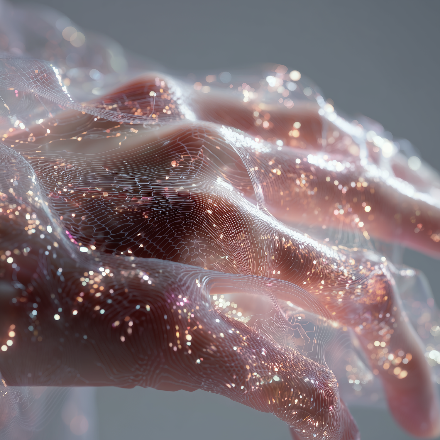 Ethereal hands wrapped in a glowing, translucent web-like material, radiating soft pink and gold hues in a futuristic, artistic style.