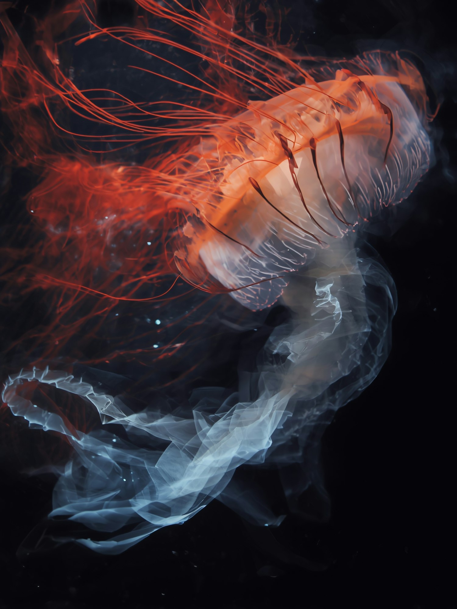 A glowing jellyfish with orange and white hues gracefully floats in a dark underwater scene, showcasing its delicate tentacles.