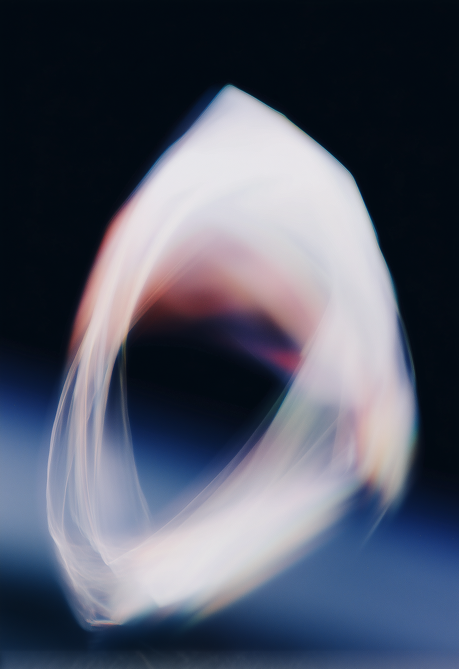 Abstract light trail forming a glowing semi-circle with soft gradients of white, pink, and blue against a dark background.