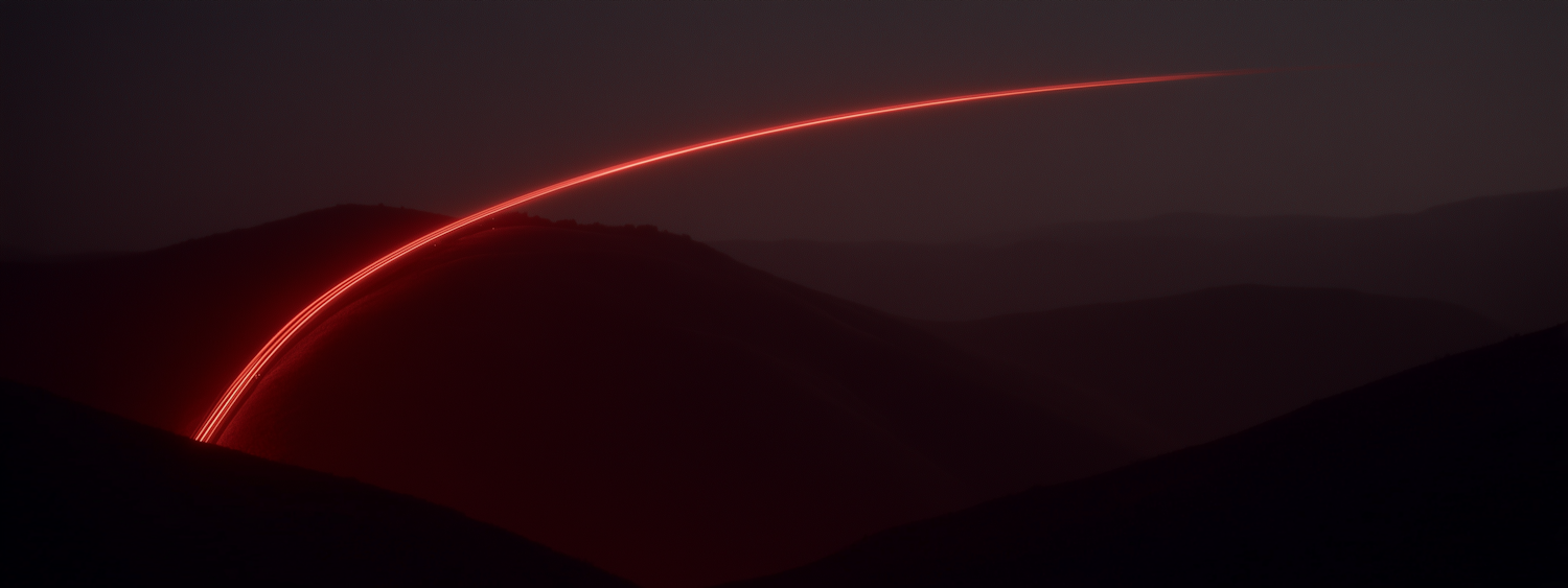 A glowing red light trail arcs over dark hills in a long-exposure shot, creating a striking contrast against the dusky background.