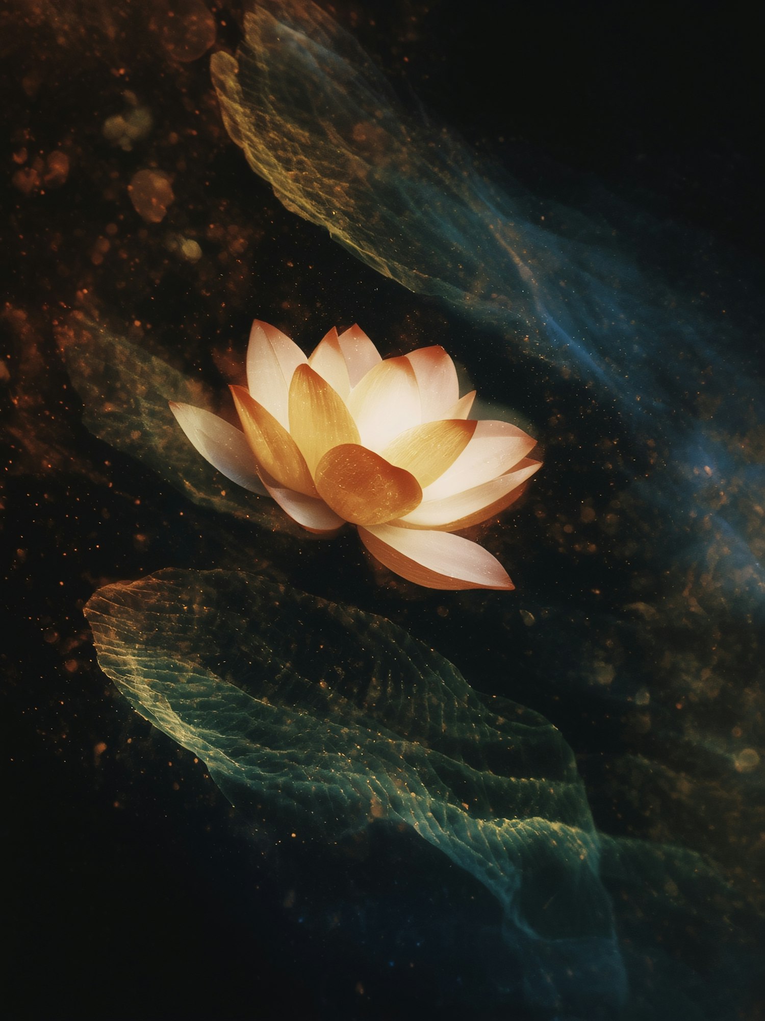 A glowing lotus flower amidst a cosmic-like background with flowing waves and golden particles, creating a serene and mystical atmosphere.