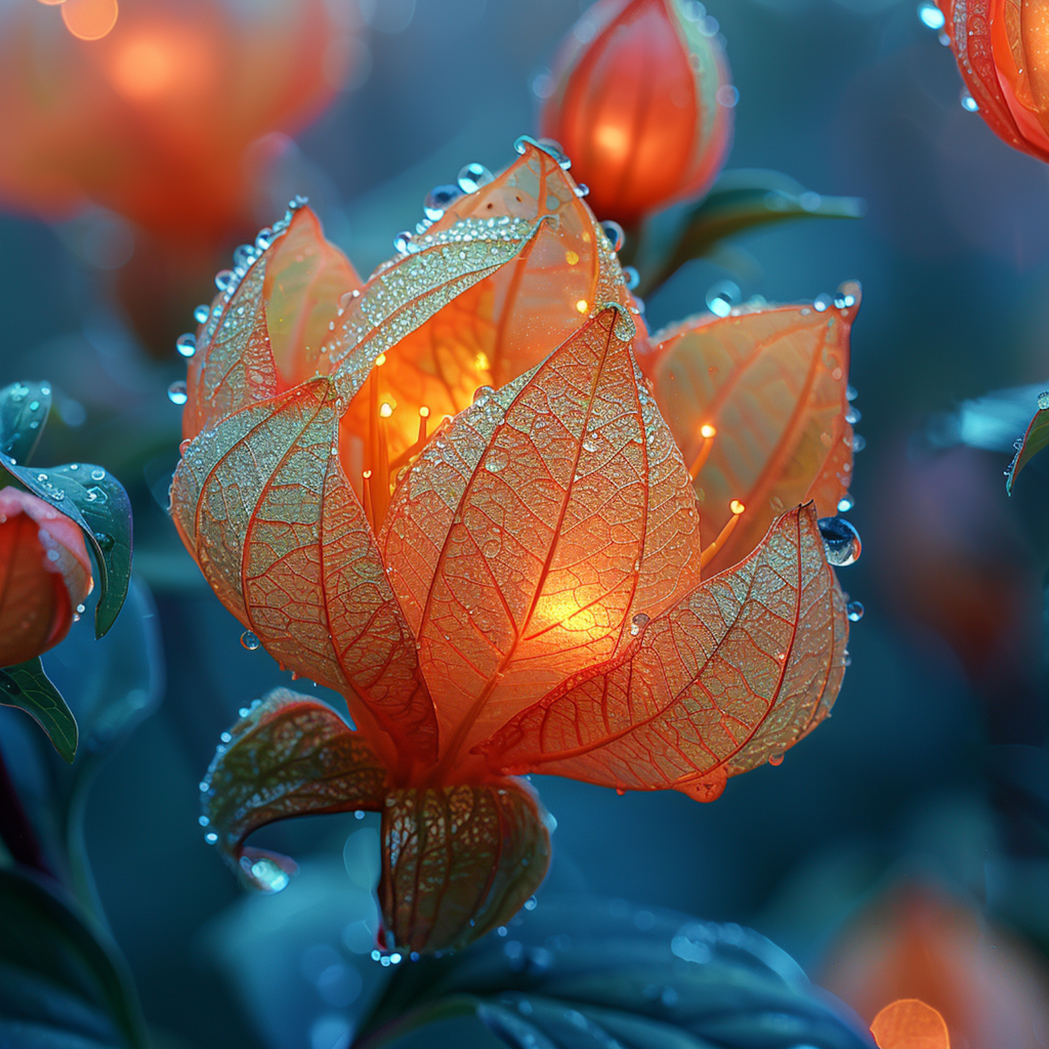 A glowing orange flower with dewy petals and intricate veining, set against a dreamy blue-green background.