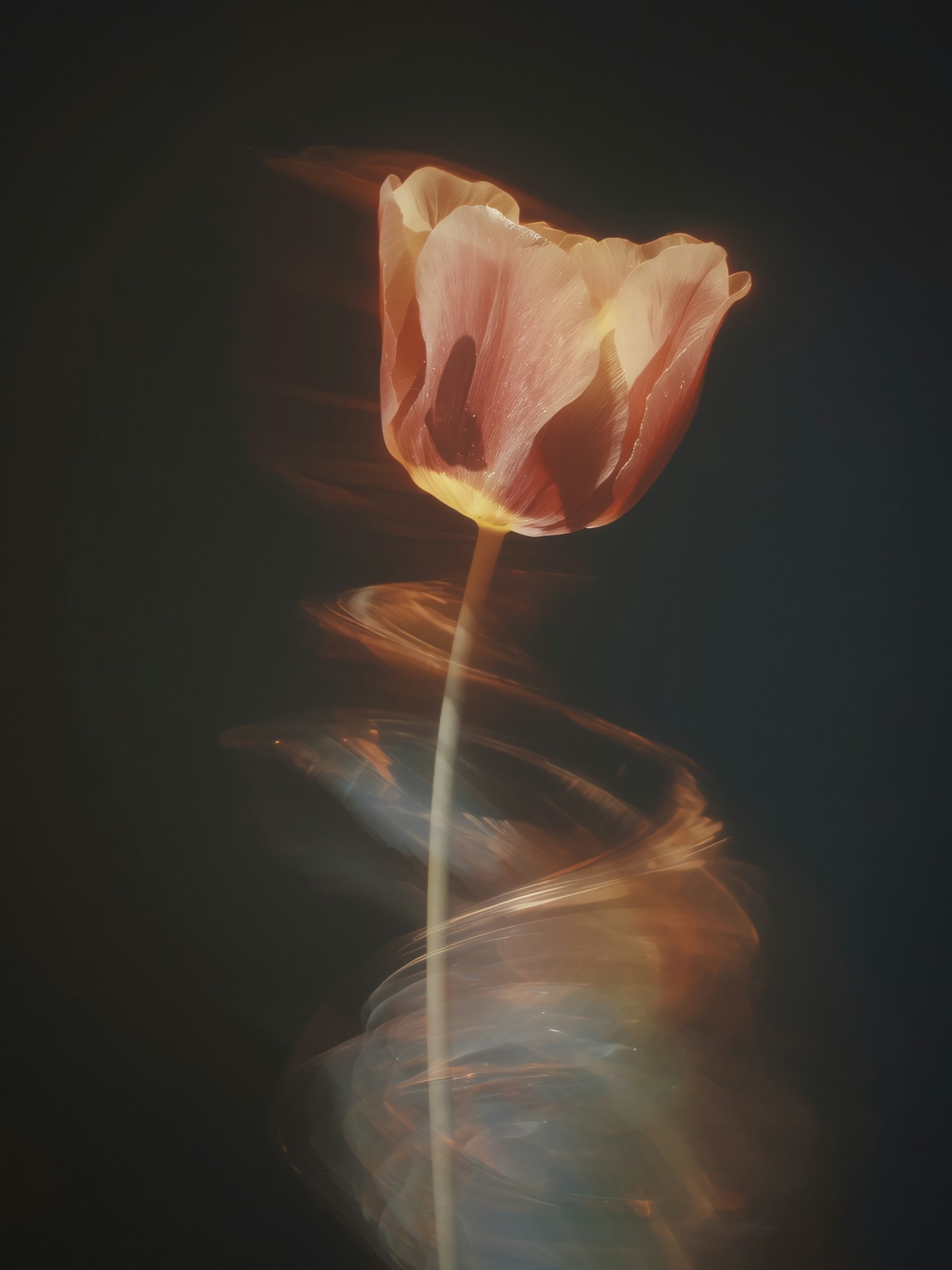 A glowing tulip with pink petals and swirling light trails against a dark background, creating an ethereal and dynamic visual effect.