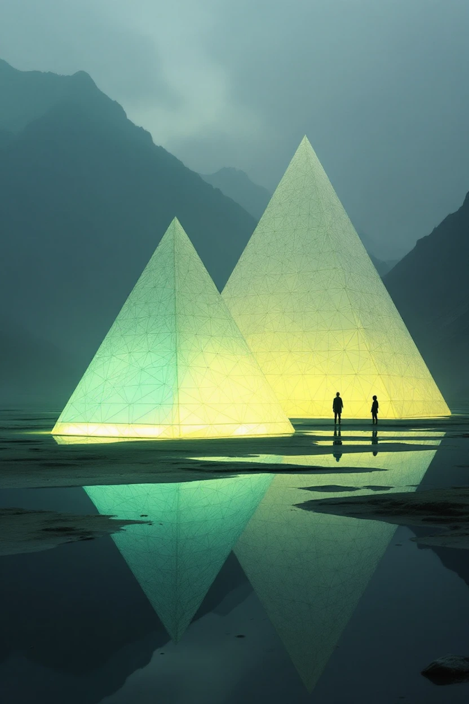 Glowing pyramids in a misty landscape with reflections and silhouetted figures, creating a serene and mysterious atmosphere.