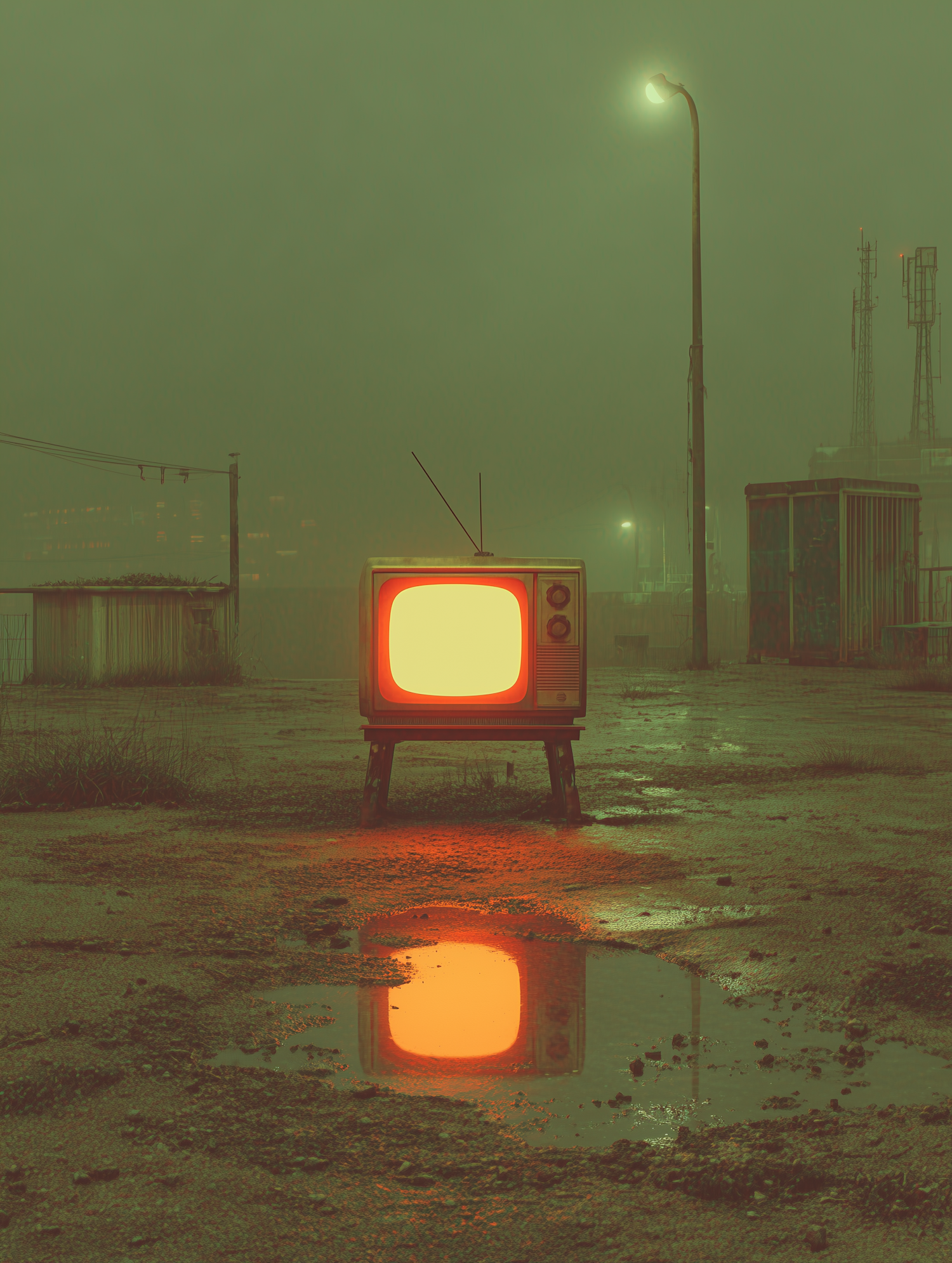 A glowing vintage TV in a foggy, desolate outdoor setting, reflecting in a puddle, creating a surreal and atmospheric scene.