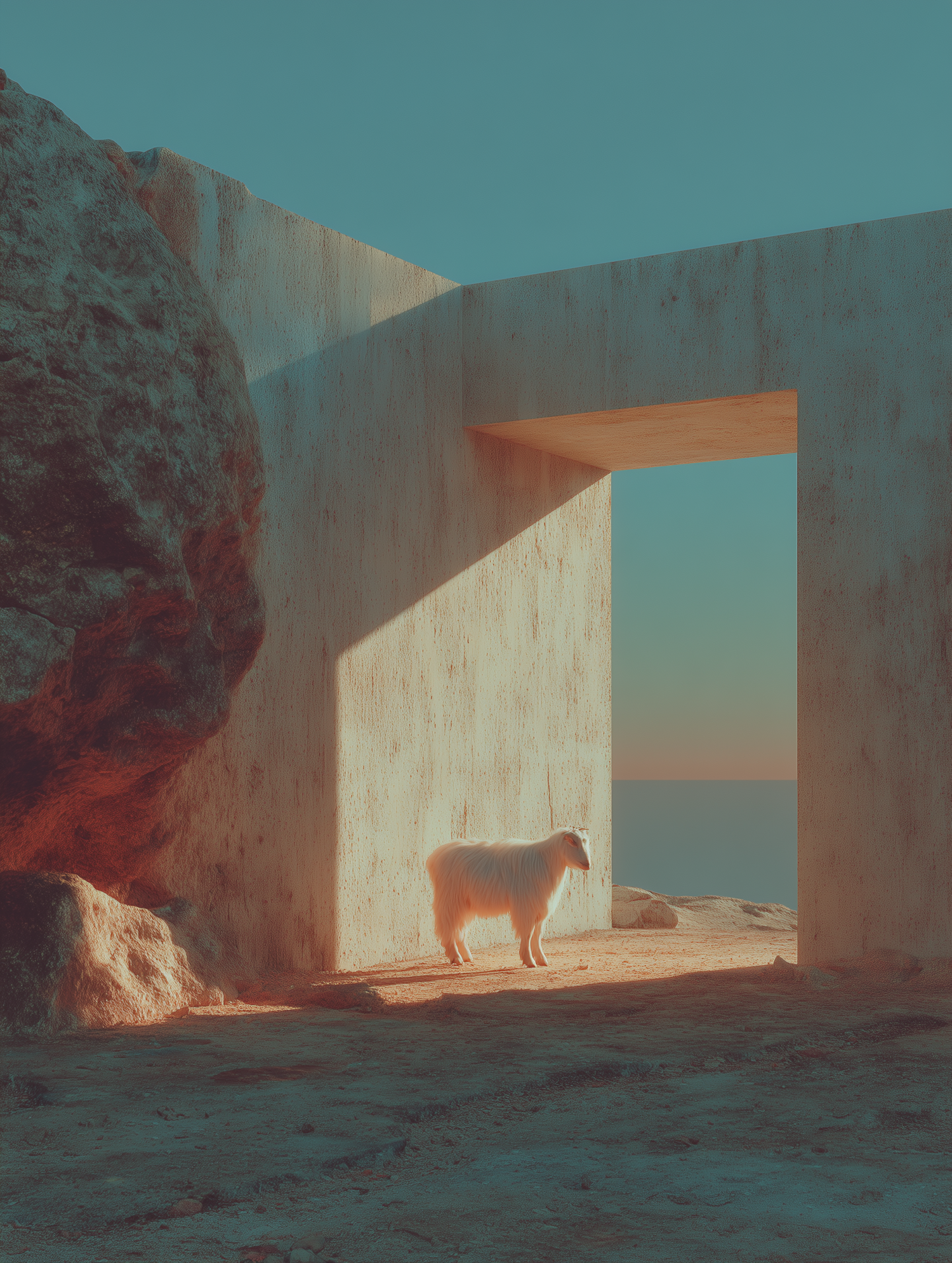 A white goat stands in sunlight framed by minimalist concrete architecture, with a serene sky and natural rock elements in the scene.
