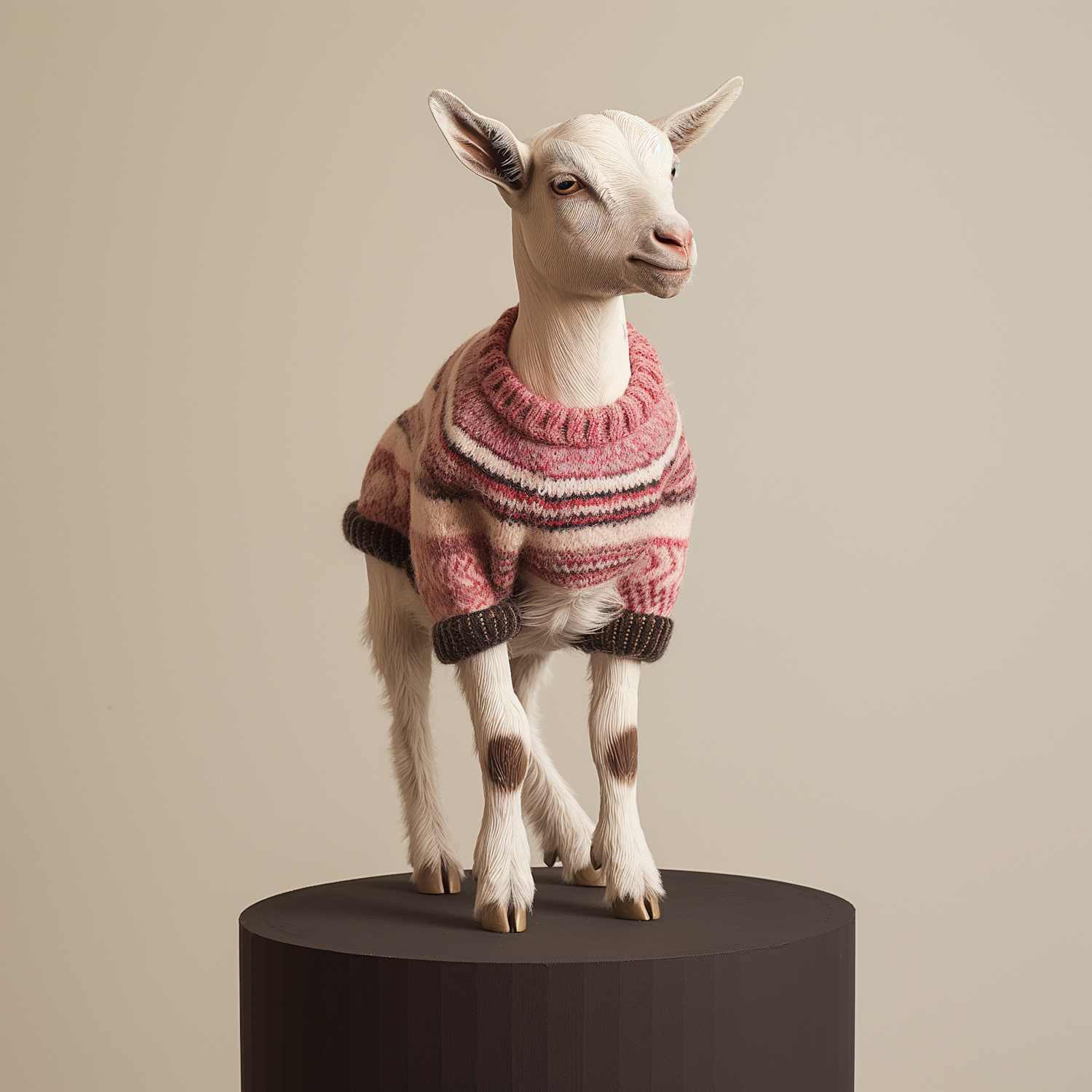 Adorable young goat in a pink and brown knit sweater, standing on a black pedestal against a neutral beige background.