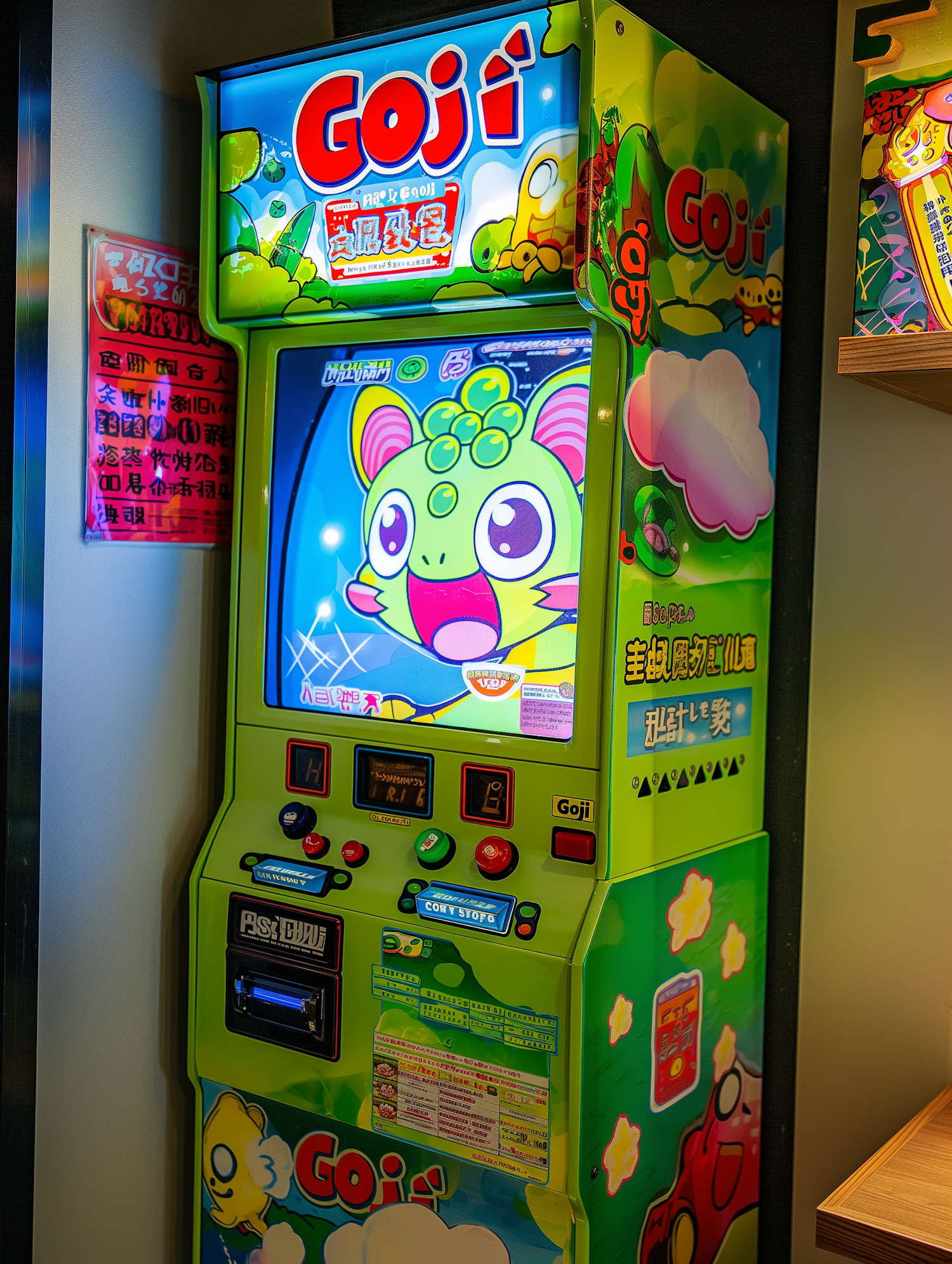 Bright green arcade machine with cartoon graphics and 'Goji' branding, featuring playful designs and interactive buttons.