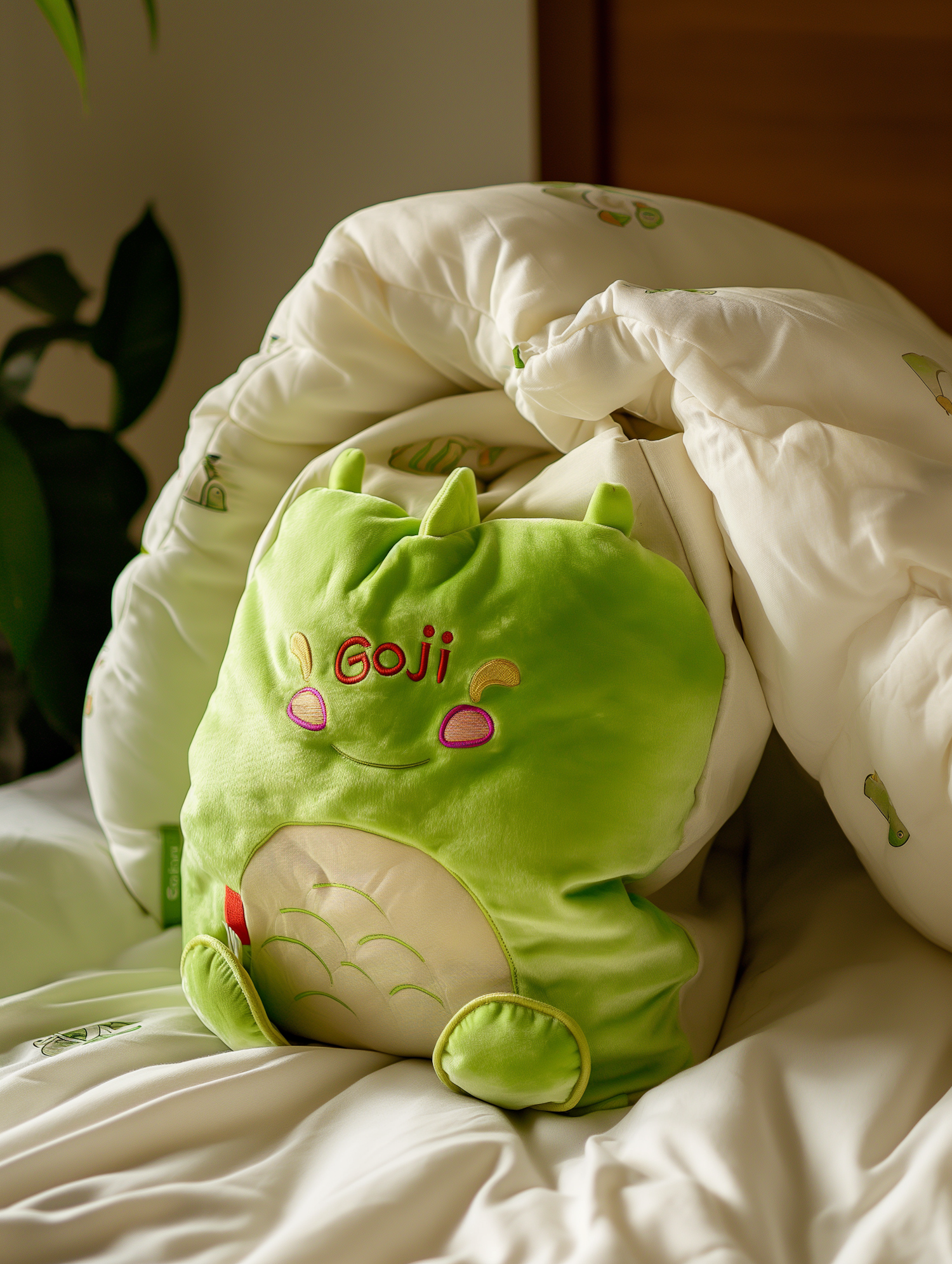 Adorable green dinosaur pillow 'Goji' nestled in a cozy cream comforter with subtle patterns, perfect for a warm and inviting bedroom.