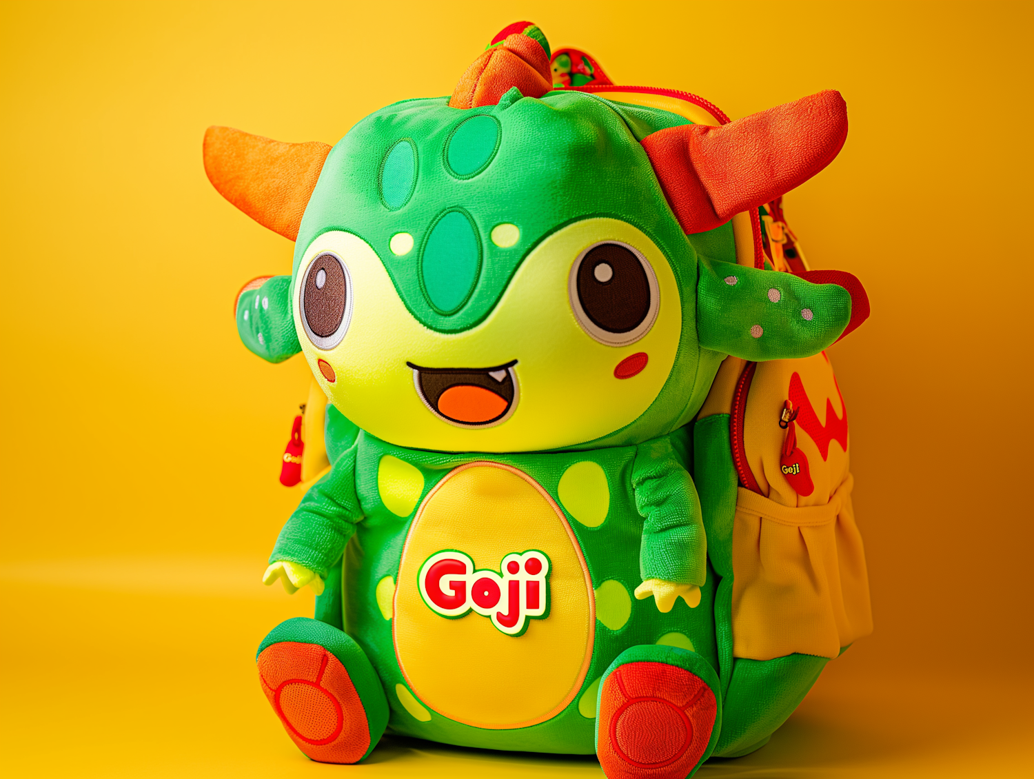 Cute green and orange creature-themed backpack with 'Goji' logo on a bright yellow background. Perfect for kids.