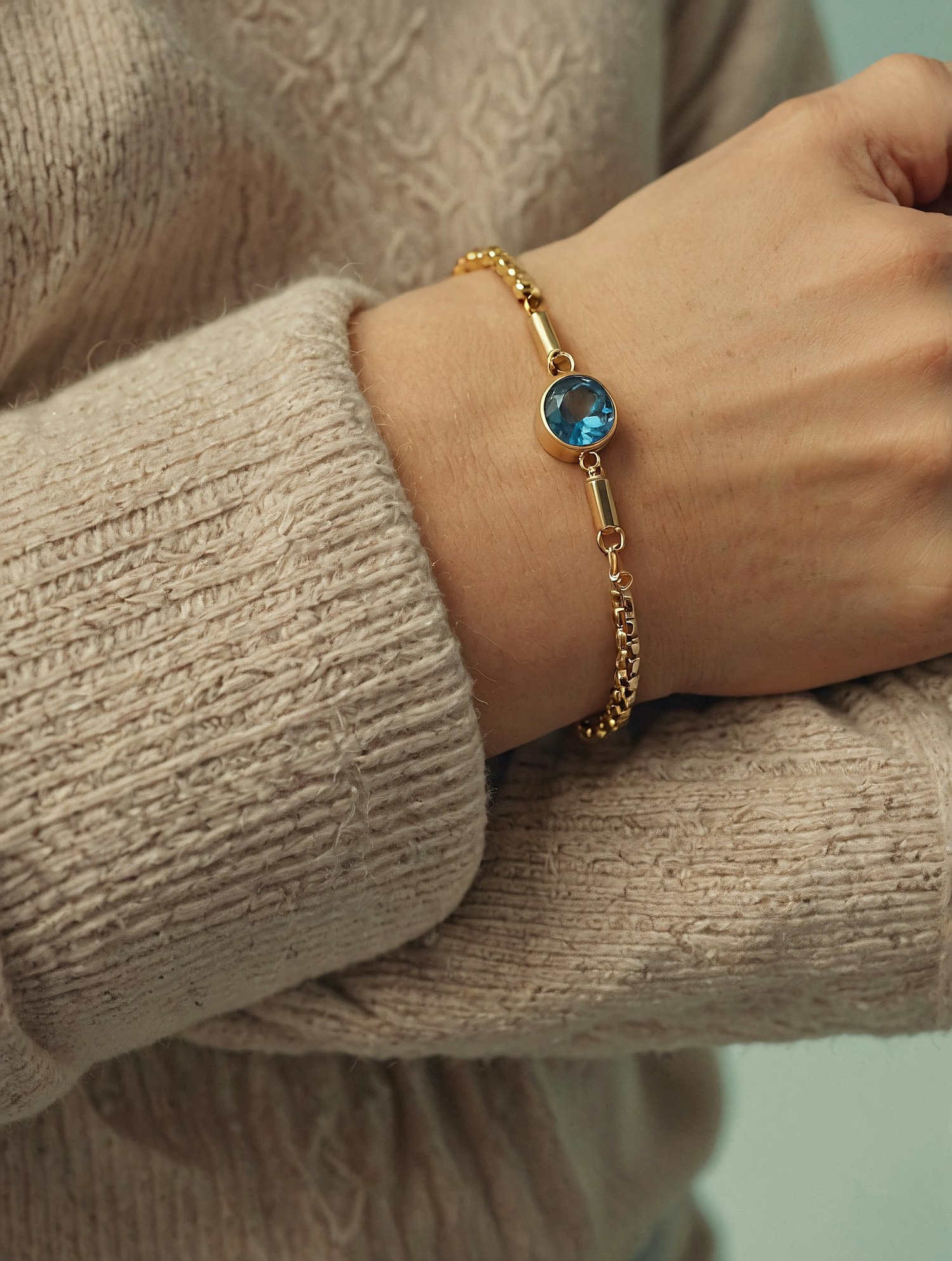 Elegant gold bracelet with a vibrant blue gemstone on a wrist, paired with a cozy beige knit sweater for a chic and warm look.