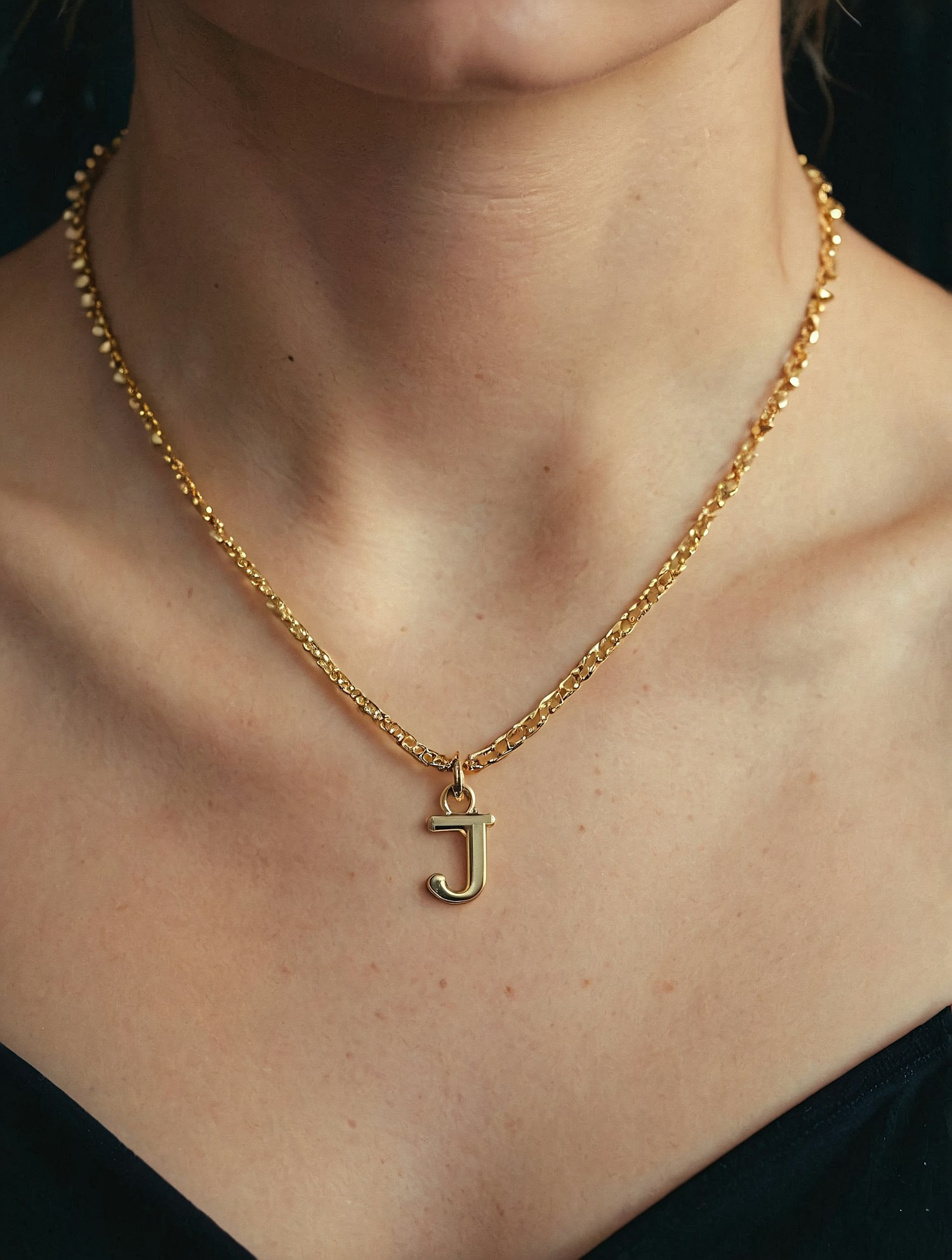 Elegant gold chain necklace with a 'J' pendant, worn against a black outfit. Perfect for personalized, stylish jewelry inspiration.