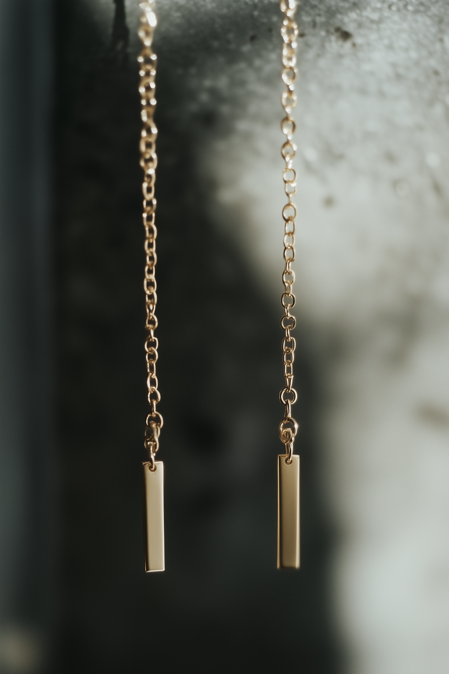 Elegant gold chain earrings with rectangular bar pendants, captured in soft lighting against a blurred gray background.
