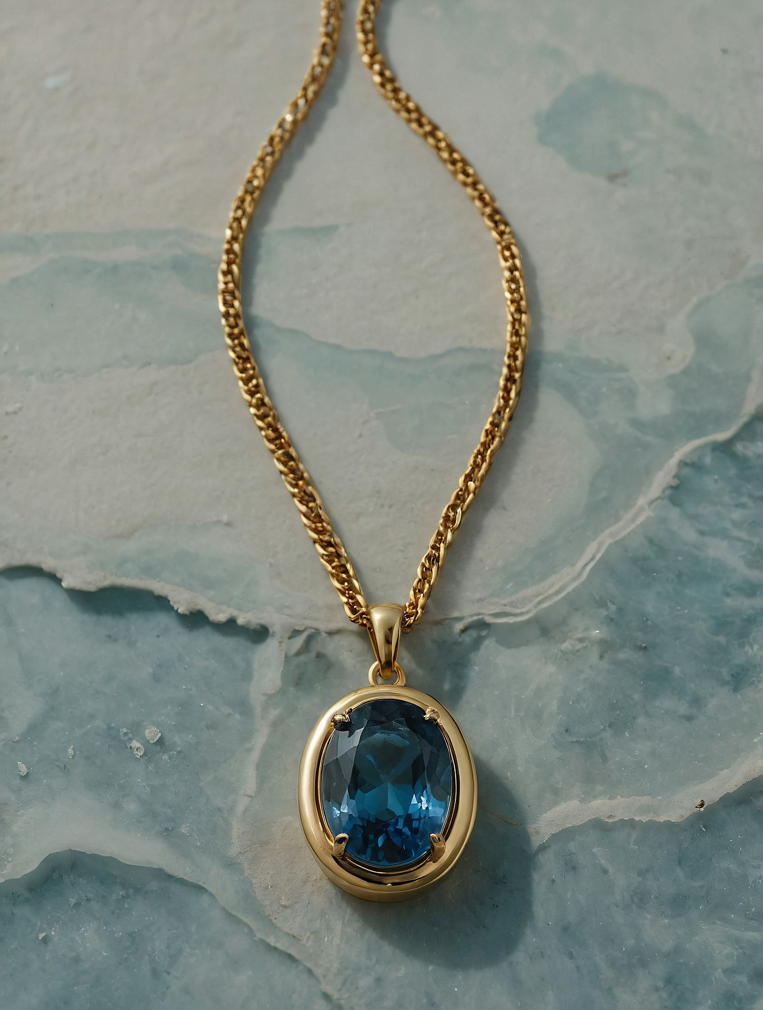 Elegant gold chain necklace with a deep blue gemstone pendant on a textured blue background, highlighting luxury and sophistication.