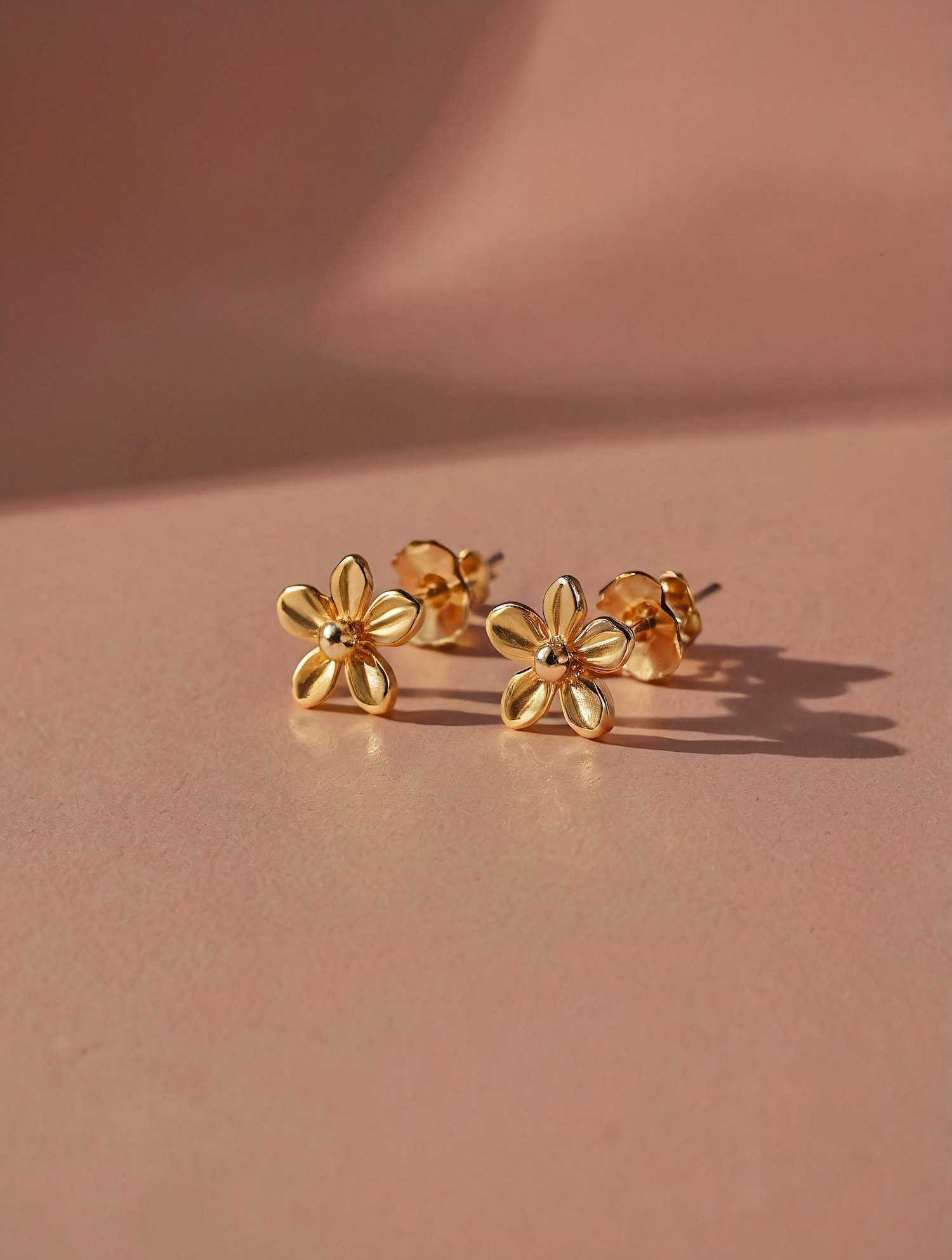 Elegant gold flower-shaped stud earrings with a polished finish, displayed on a soft pink surface with subtle lighting and shadows.