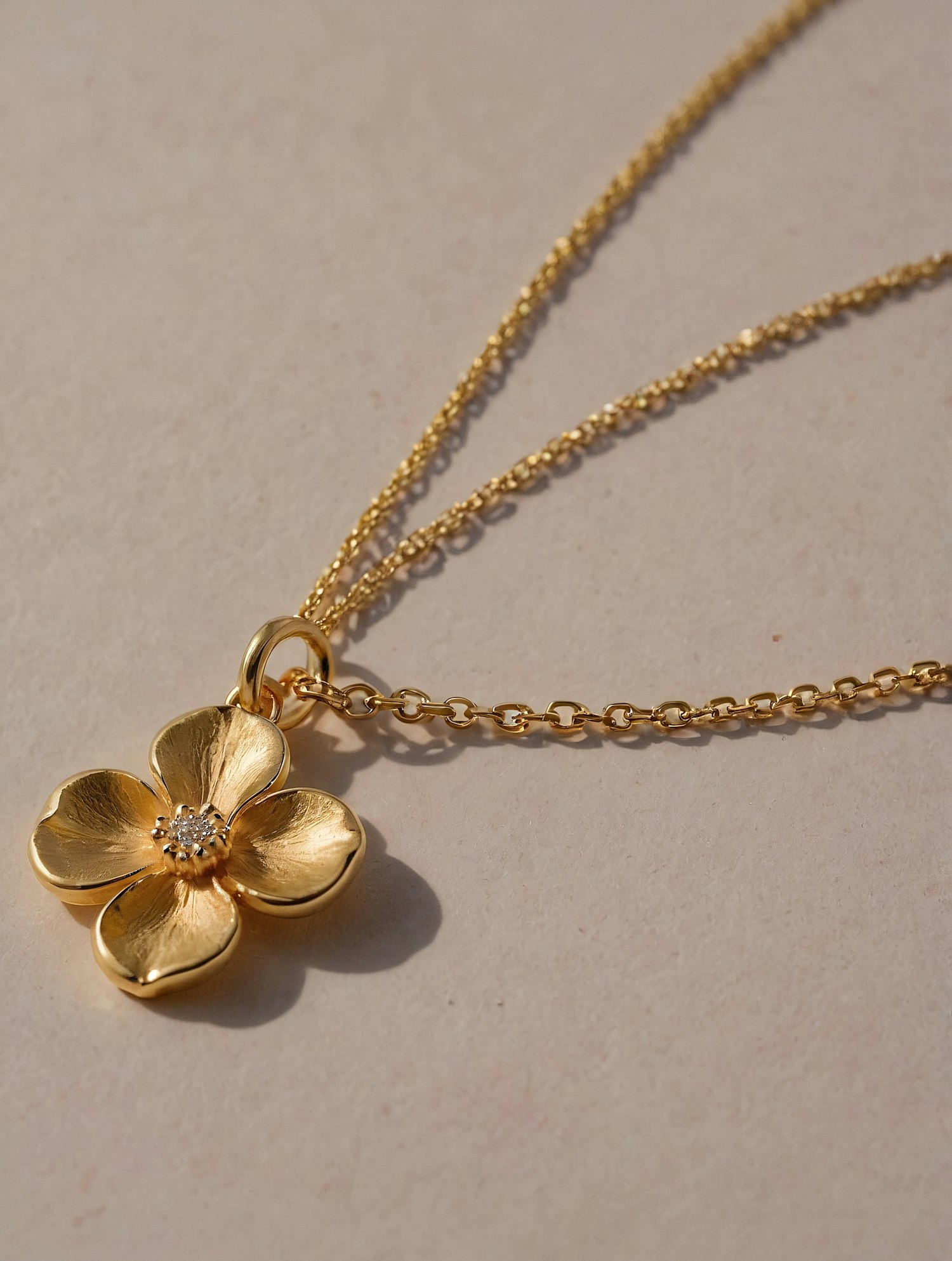 Elegant gold necklace with a flower-shaped pendant and a sparkling gemstone center, perfect for adding a touch of charm to any outfit.