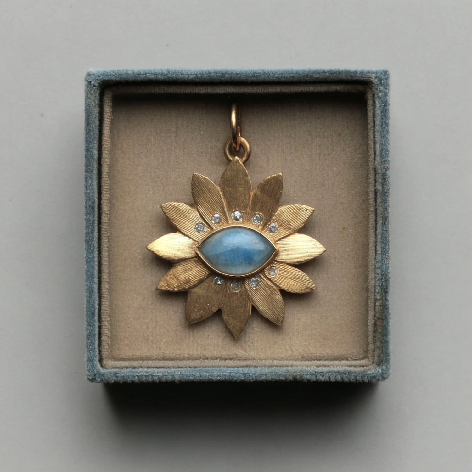 Elegant gold flower pendant with a blue gemstone center and clear accents, presented in a soft velvet box.