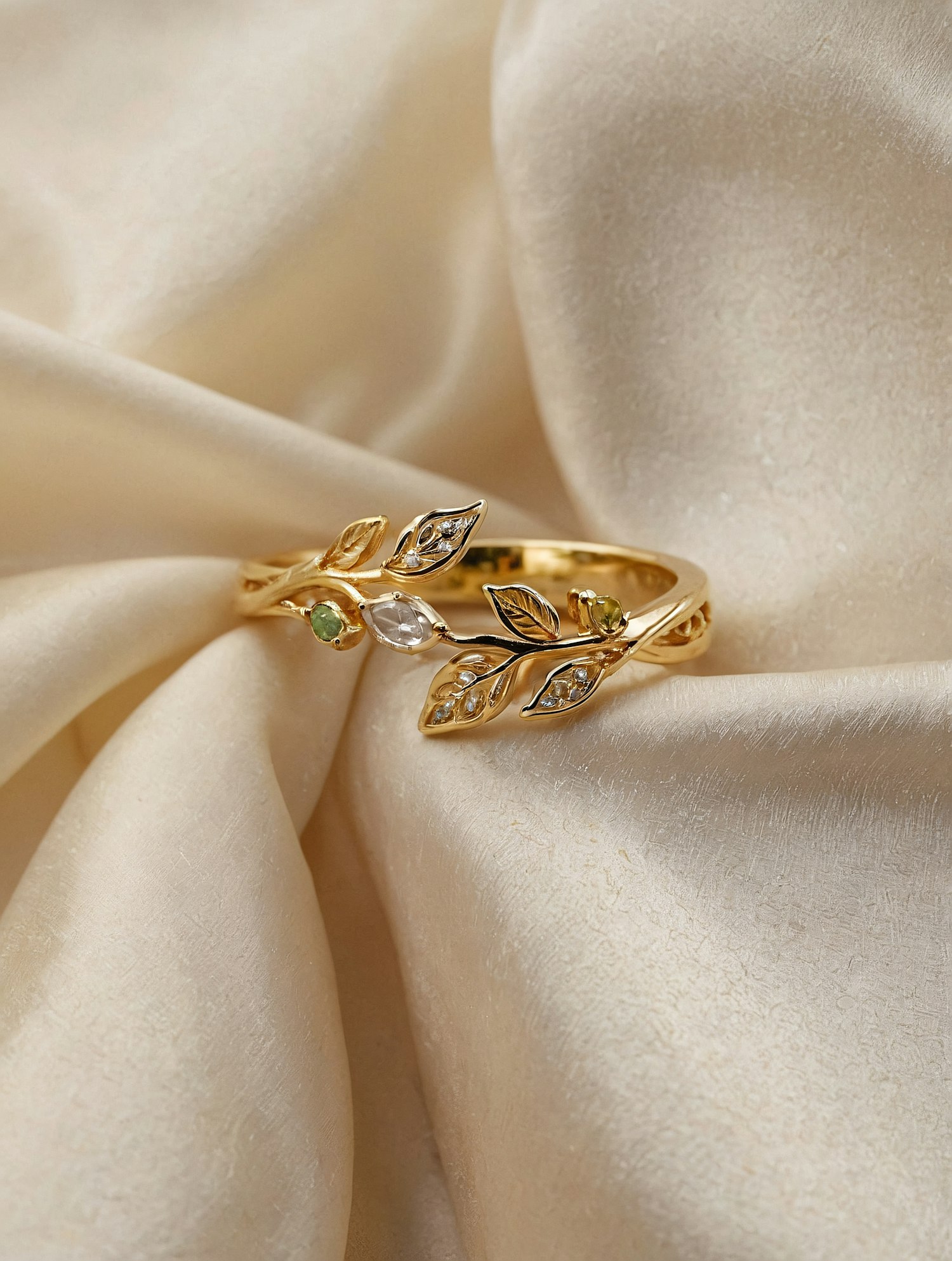 Elegant gold ring with leaf motifs and sparkling gemstones, set against a soft cream satin fabric for a luxurious look.