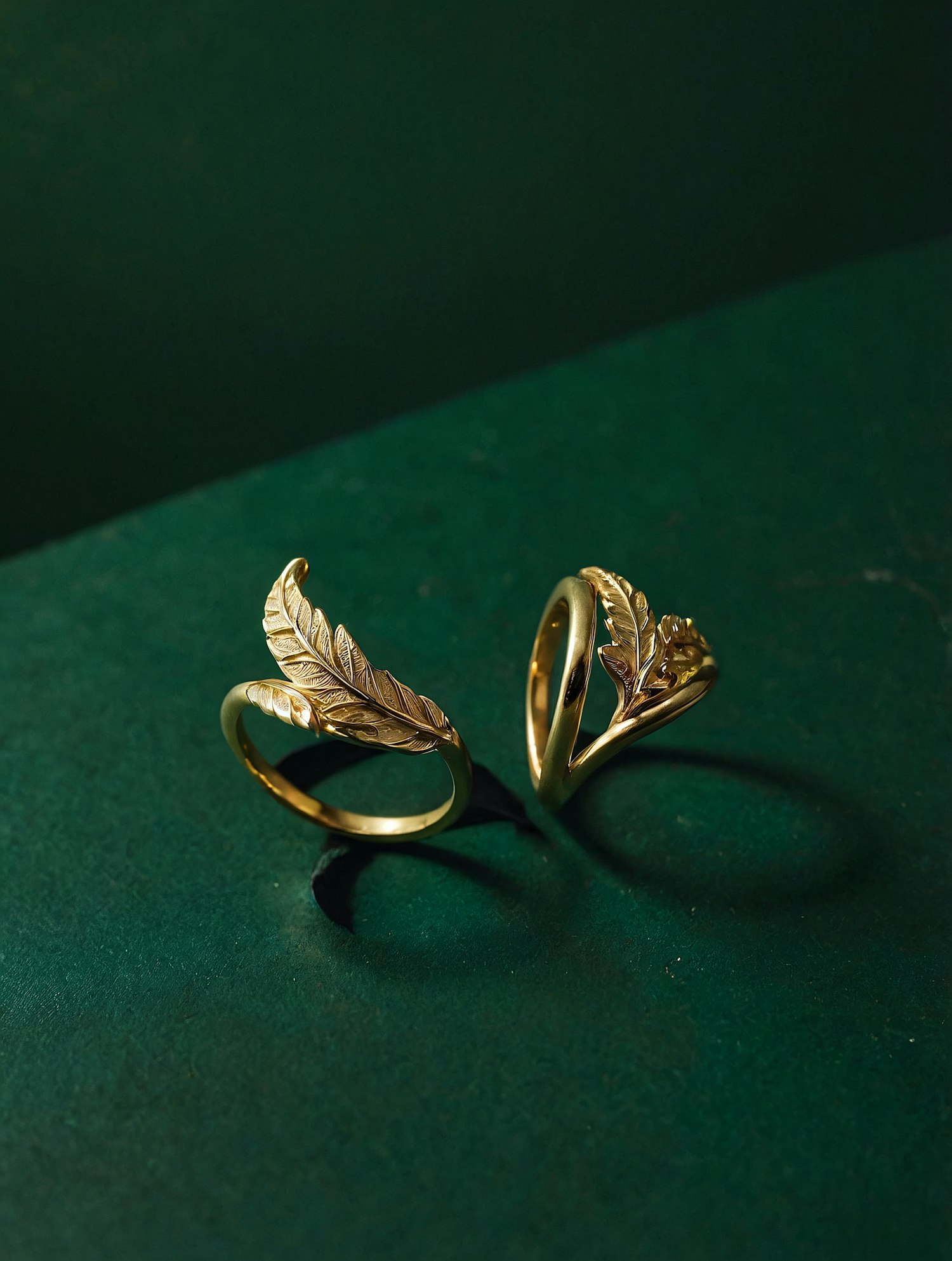 Elegant gold rings with intricate leaf designs on a deep green background, showcasing luxury and craftsmanship in a minimalist setting.