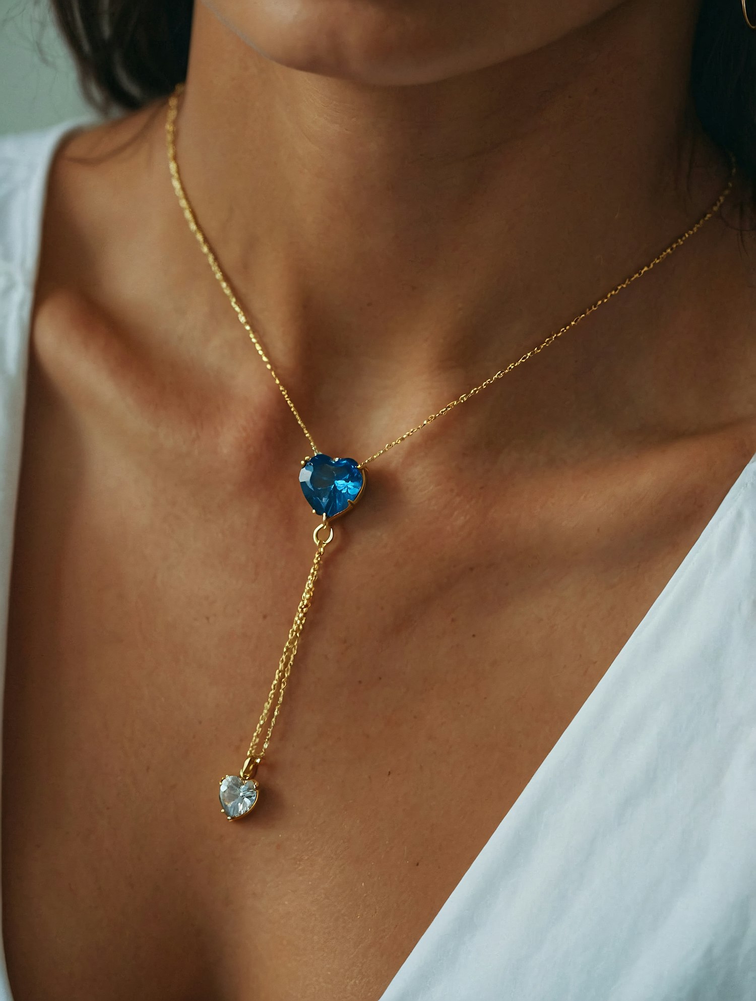 Elegant gold lariat necklace with blue and clear heart-shaped pendants, perfect for adding a touch of sophistication to any outfit.