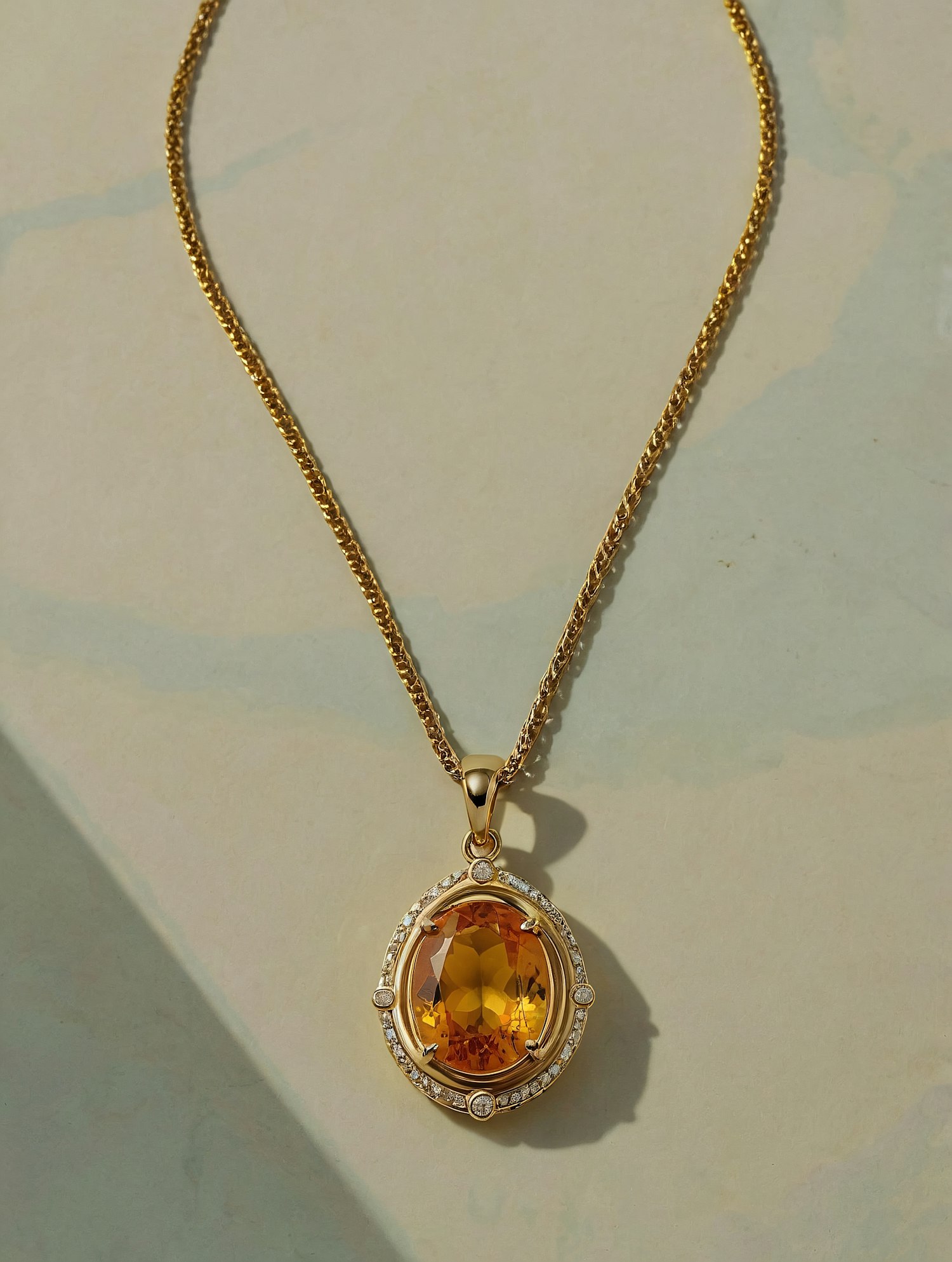 Elegant gold necklace with an amber gemstone pendant surrounded by diamonds, perfect for adding a touch of luxury to any outfit.