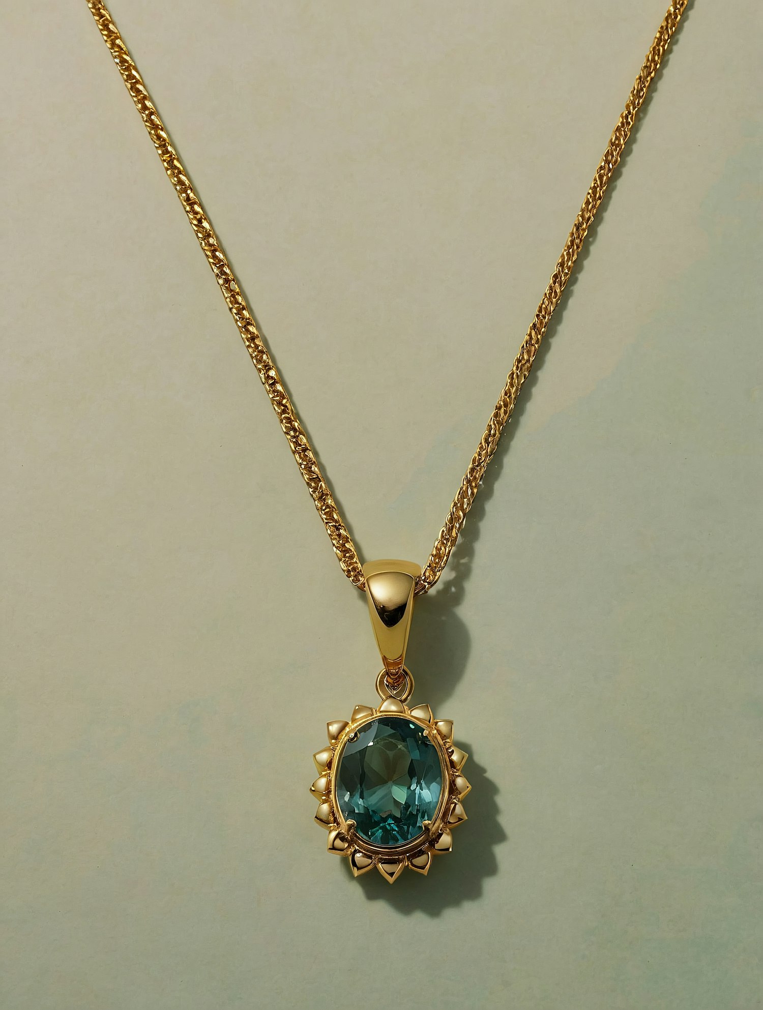 Elegant gold necklace with a blue gemstone pendant in a sunburst design, set against a soft green background.