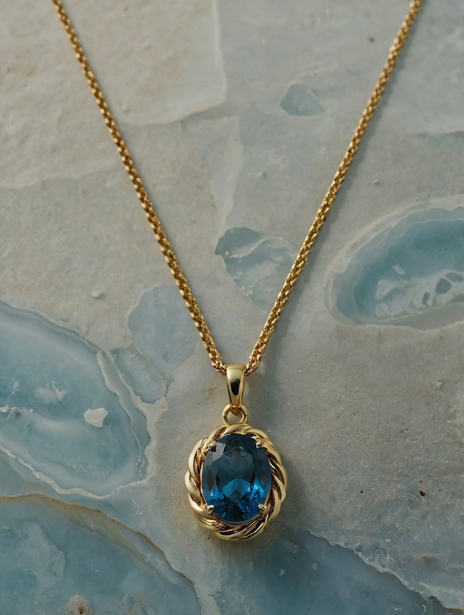 Elegant gold necklace with a blue gemstone pendant on a textured stone background, showcasing luxury and craftsmanship.