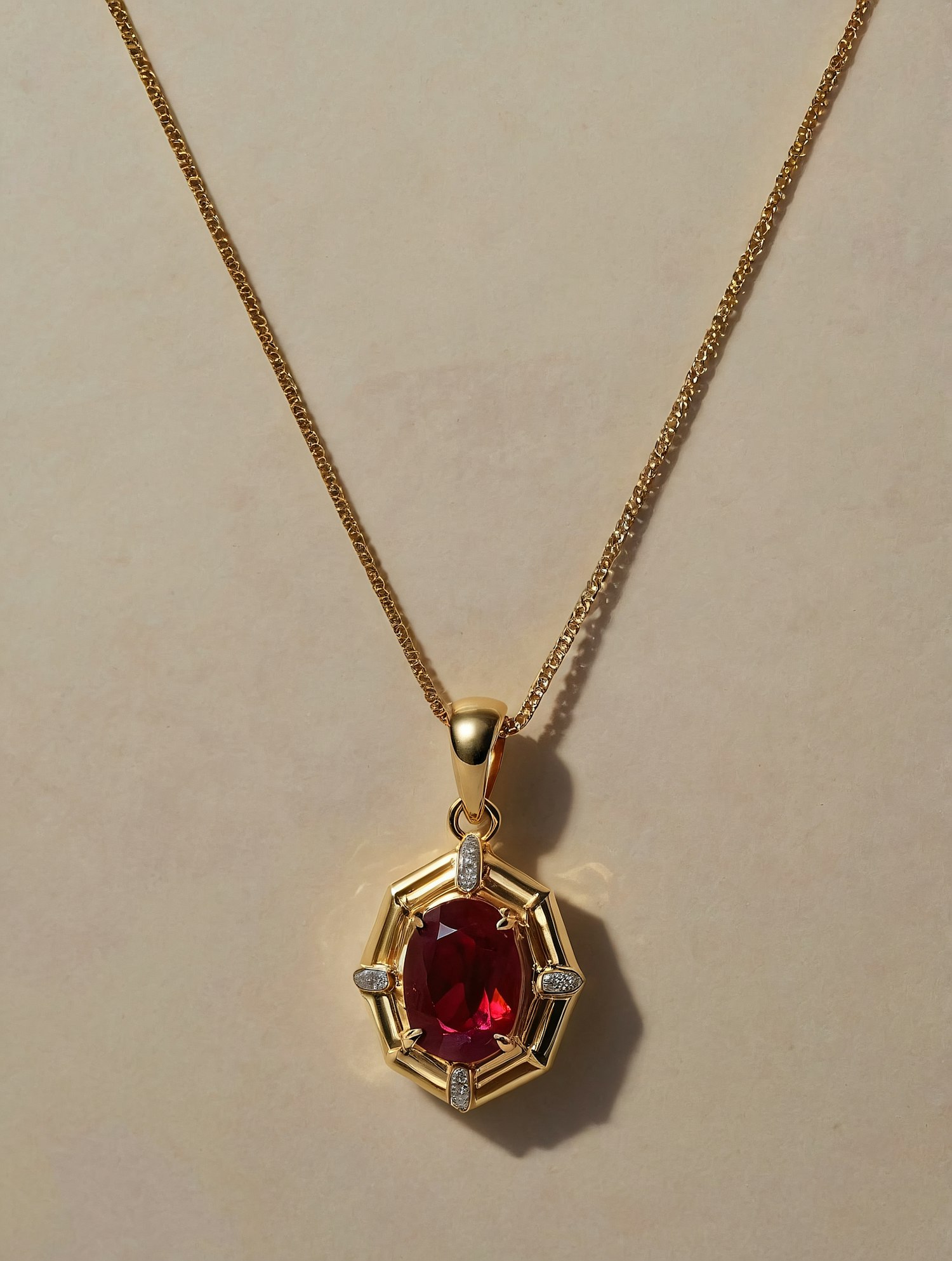 Elegant gold necklace with a red gemstone pendant, featuring intricate design and diamond accents, set against a neutral background.