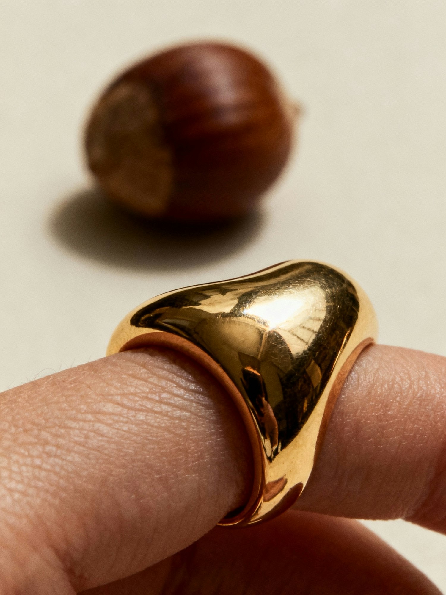 A close-up of a gold sculptural ring on a finger, with a blurred acorn in the background on a neutral surface.