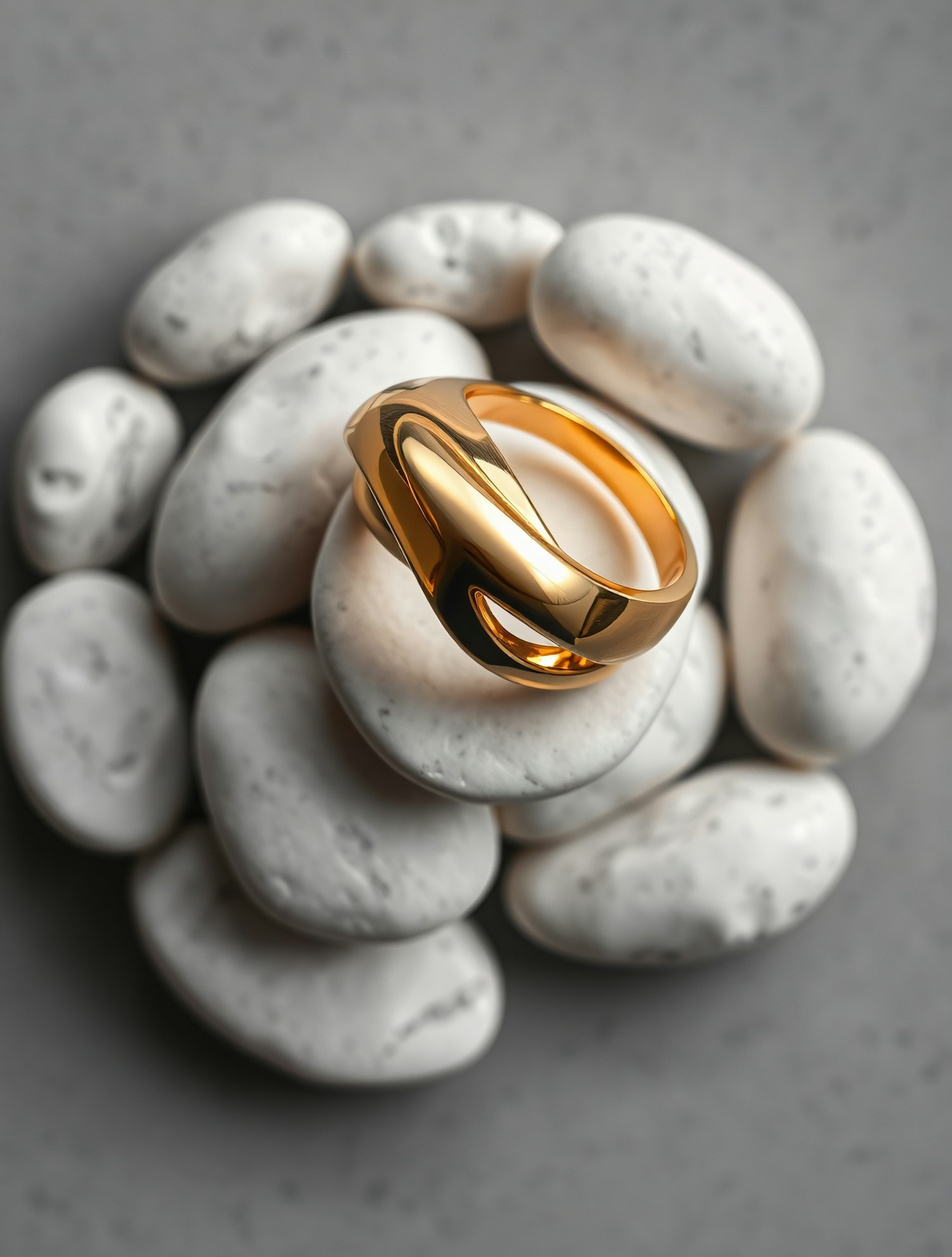 Elegant gold ring with abstract design on smooth white pebbles, creating a minimalist and luxurious aesthetic.