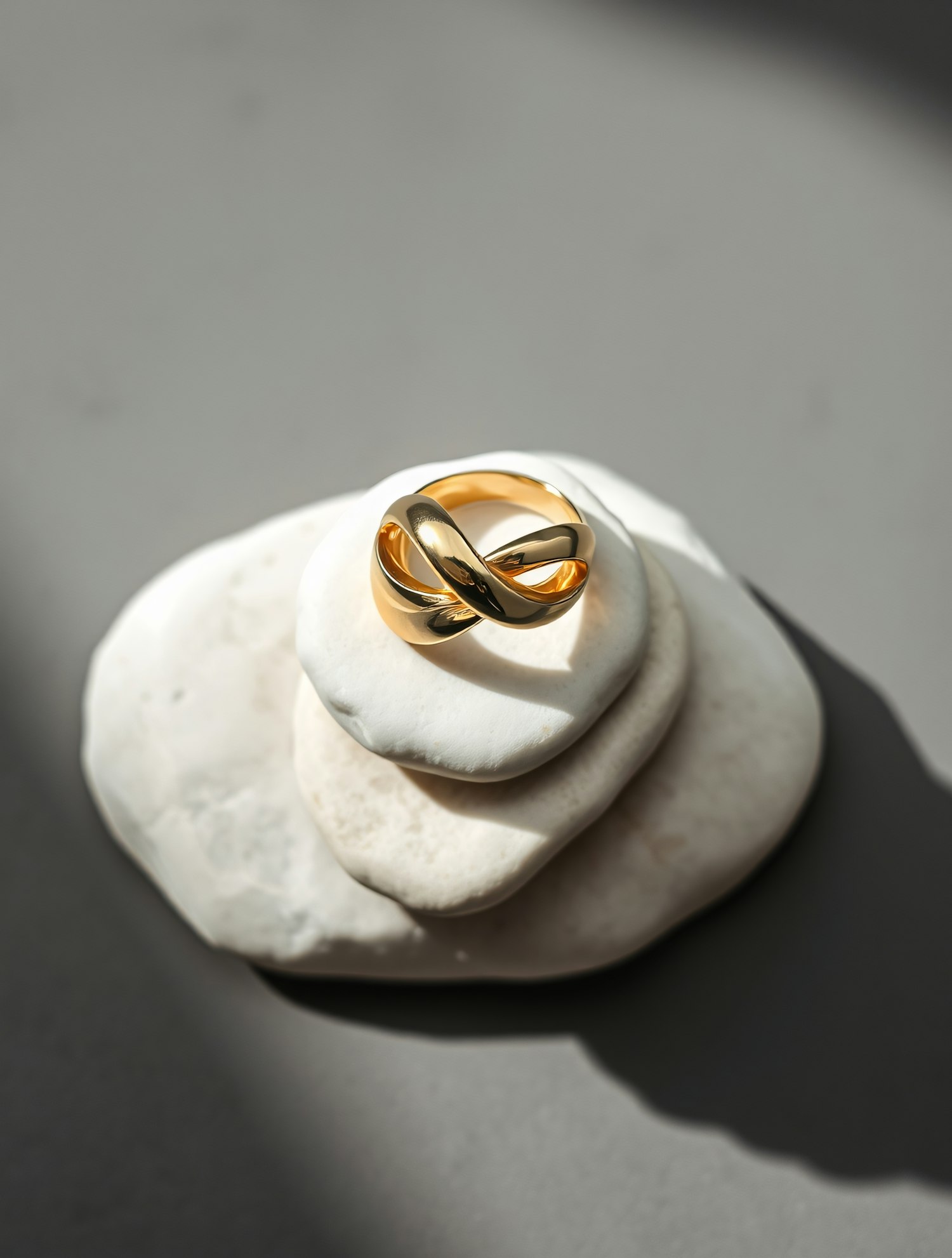 Elegant gold ring with intertwined design on smooth white stones, set against a neutral gray background with soft shadows.