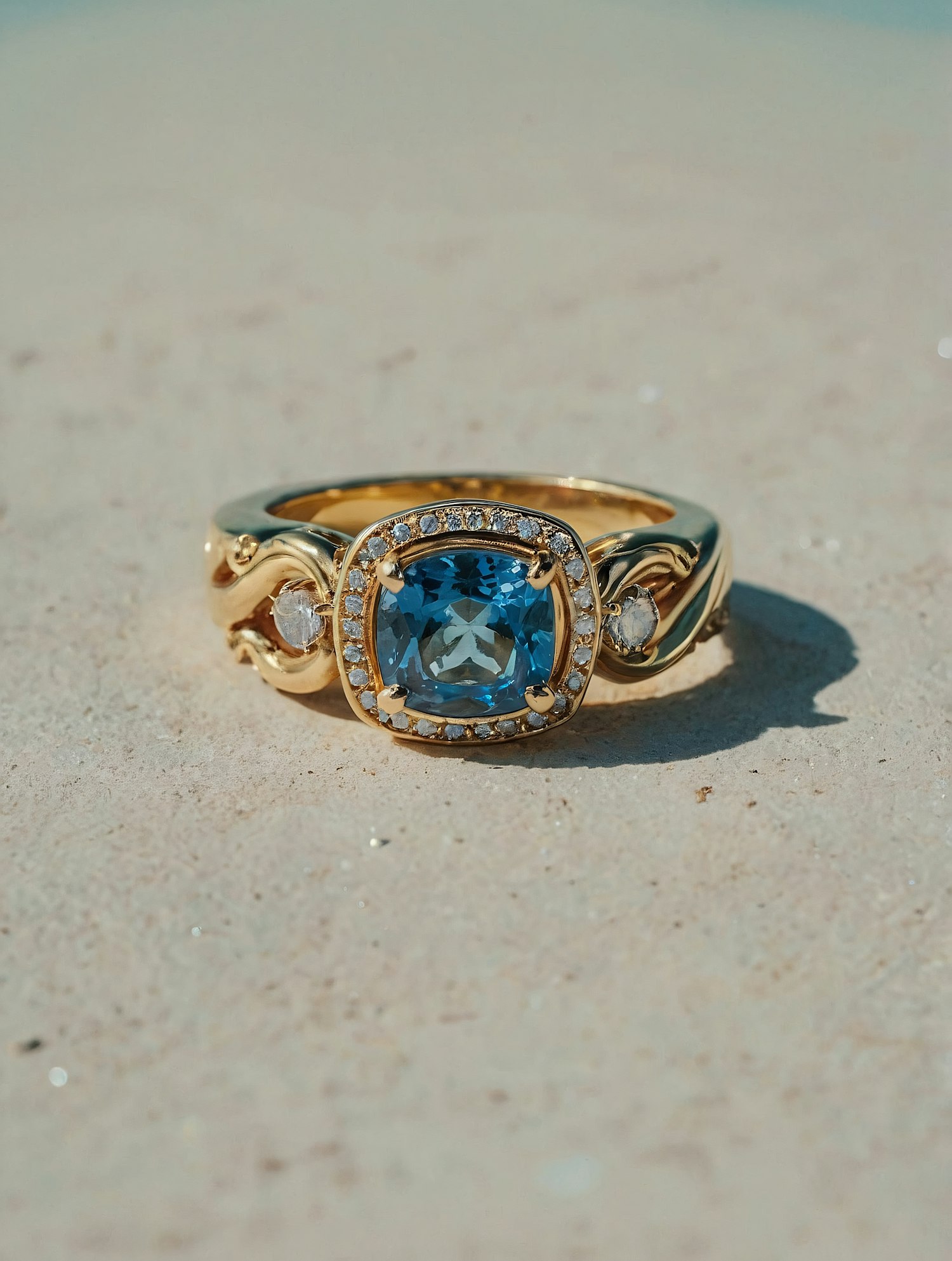 Elegant gold ring with a cushion-cut blue gemstone and diamond accents, set against a sandy background for a luxurious look.