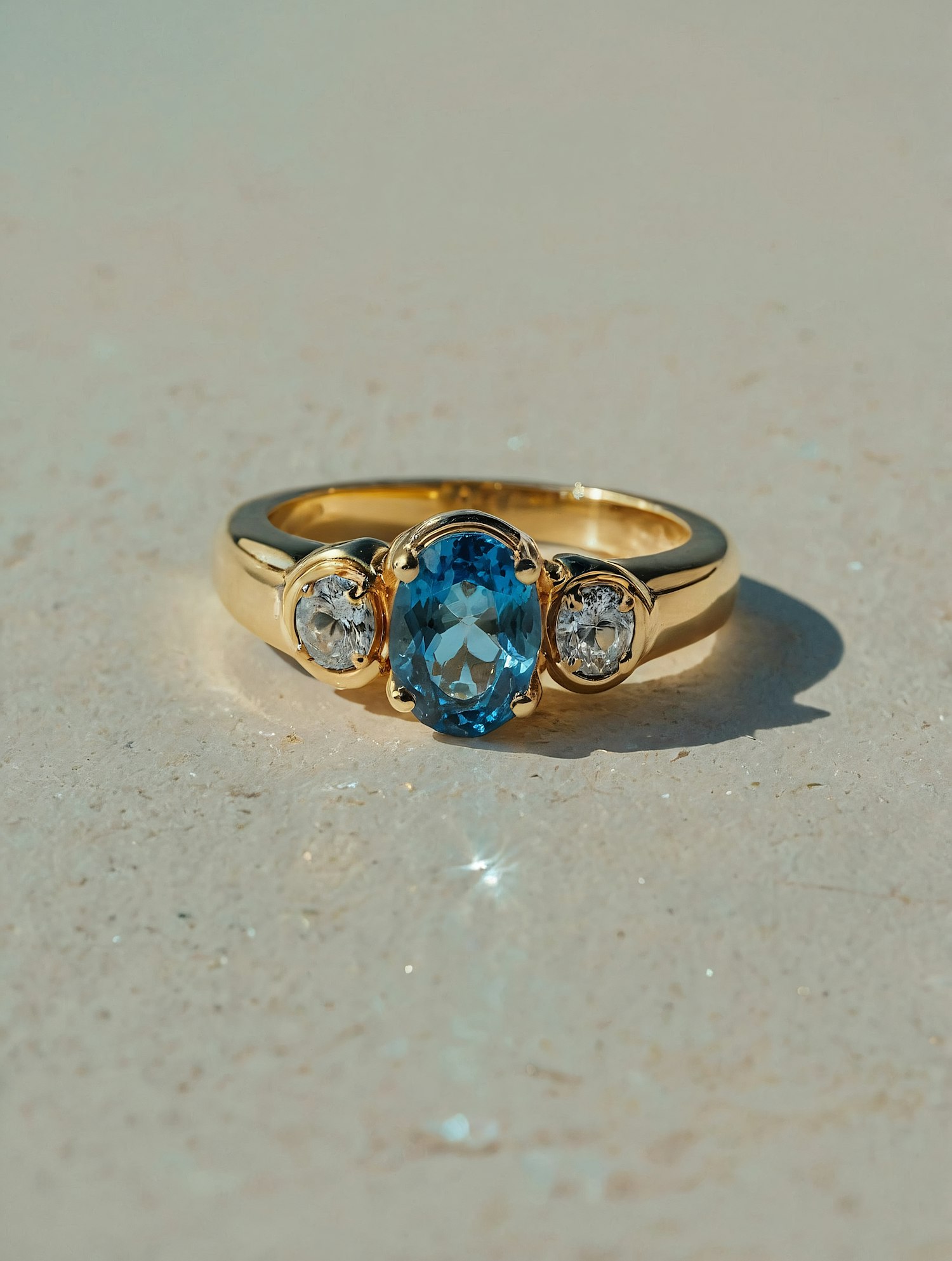 Elegant gold ring with a vibrant blue gemstone and two clear stones, set against a soft background, showcasing luxury and style.