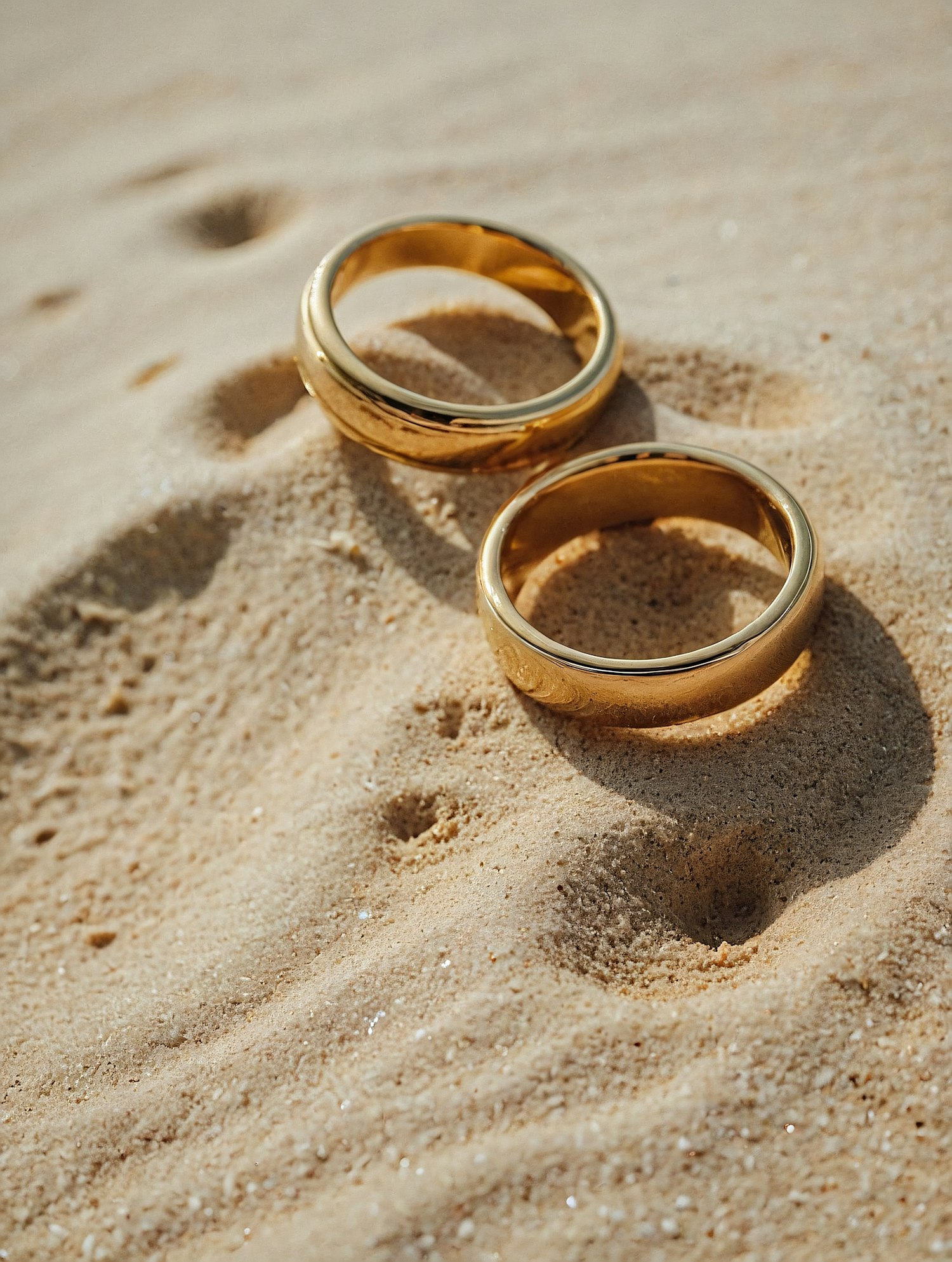 Two gold rings on a sandy beach, reflecting sunlight and symbolizing unity. A serene and romantic setting with warm, natural tones.