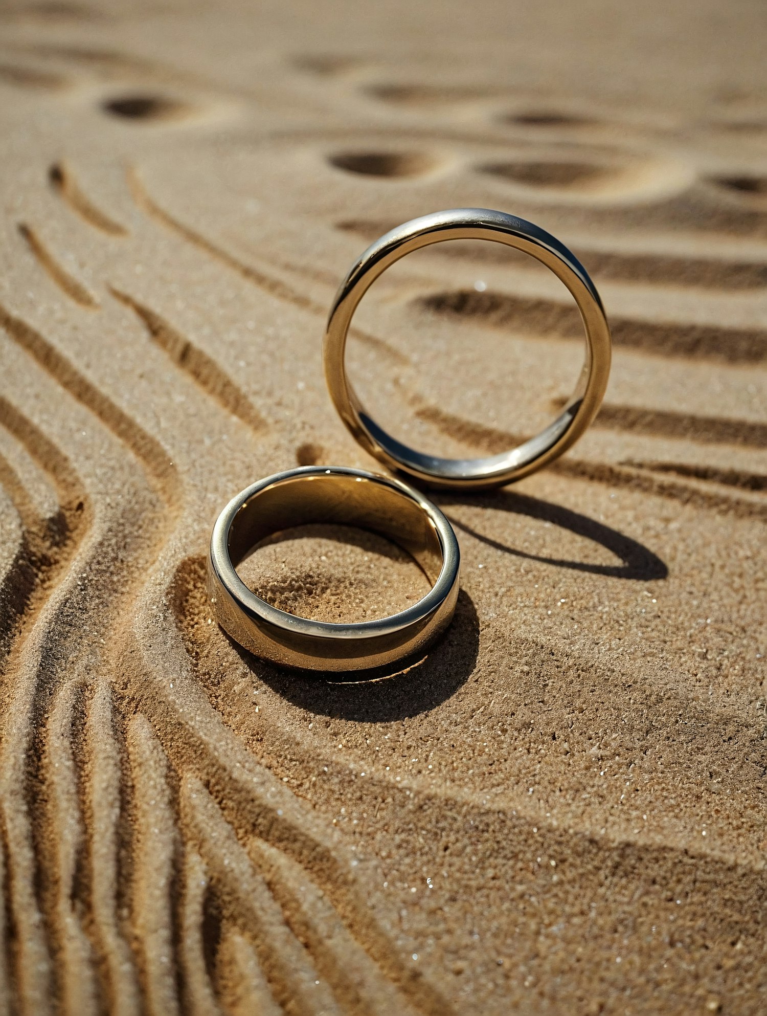 Two gold rings on patterned sand, one upright and one flat, with sunlight casting soft shadows. Warm, golden hues create a tranquil scene.