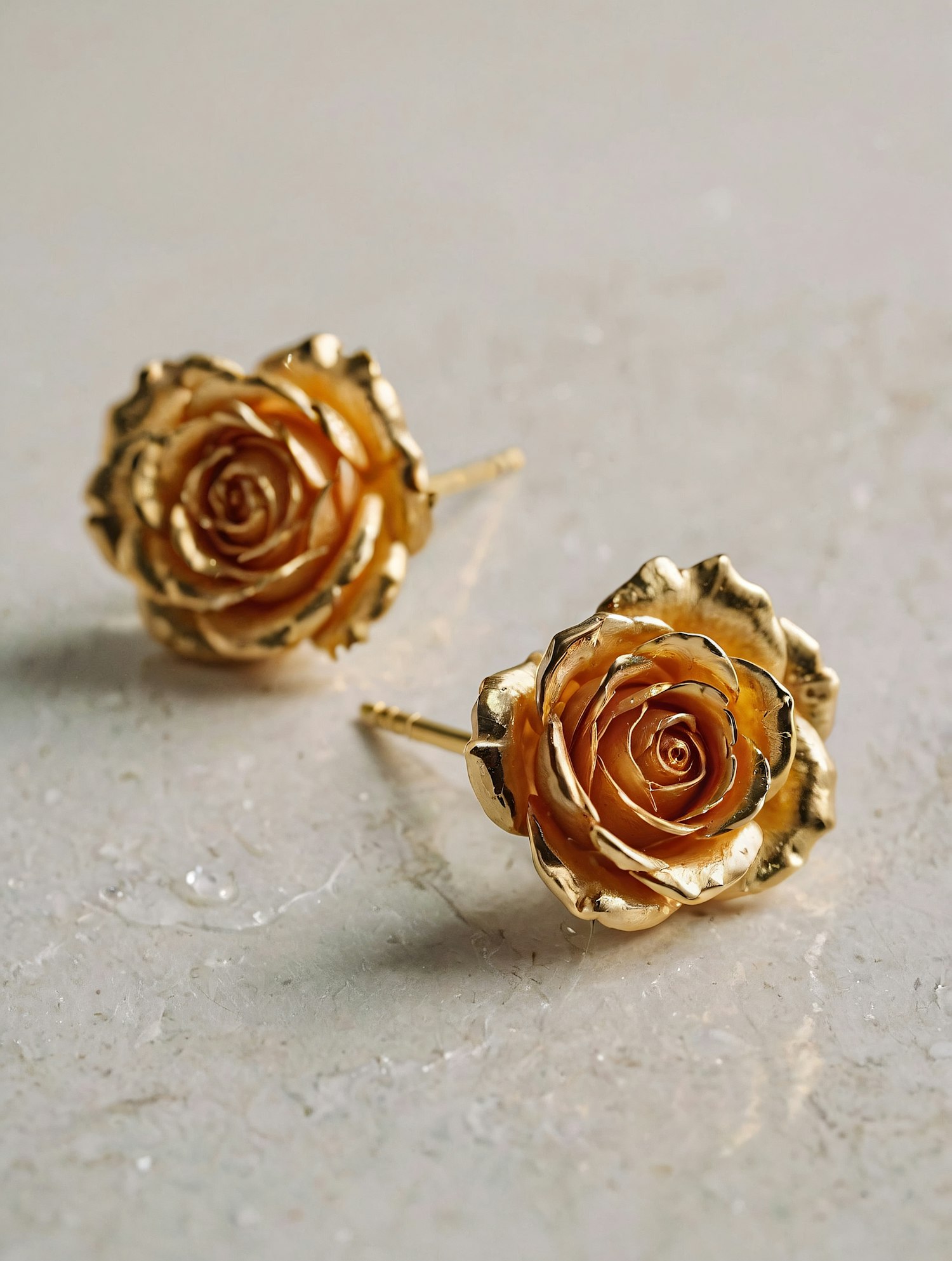 Elegant gold rose-shaped stud earrings with intricate petal details, displayed on a textured surface with subtle water droplets.