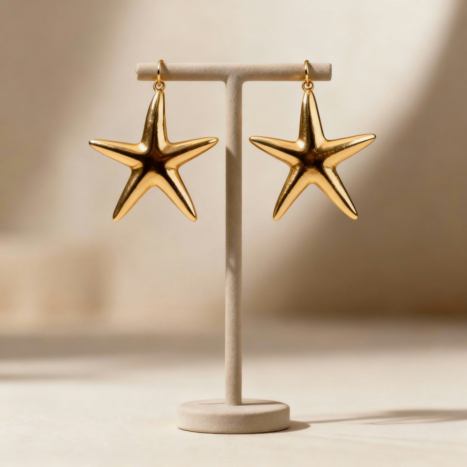 Elegant gold star-shaped earrings displayed on a minimalist stand, perfect for adding a touch of sophistication to any outfit.