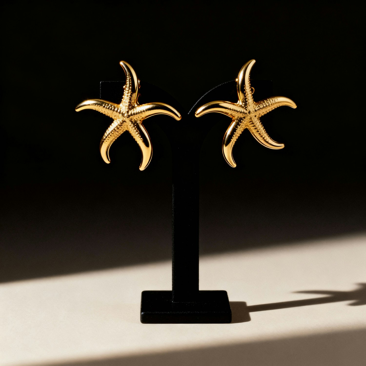Elegant gold starfish earrings on a black stand, beautifully lit against a dark background, showcasing their intricate design.