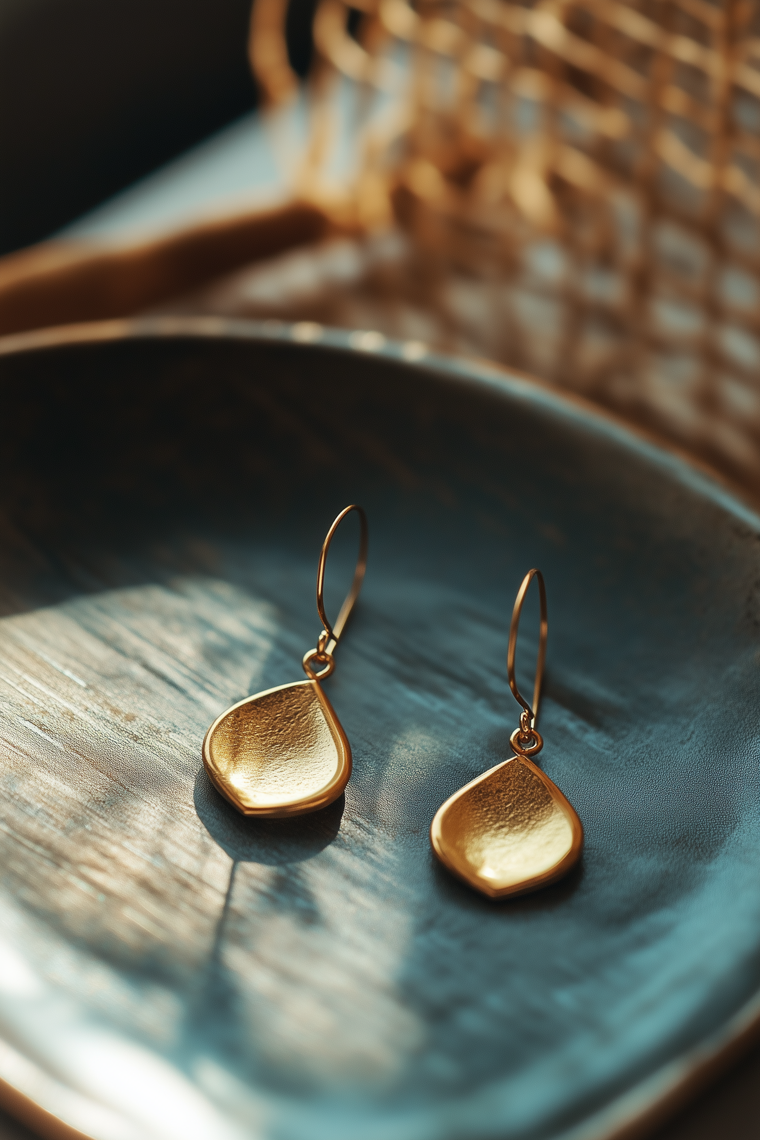 Elegant gold teardrop earrings with a hammered finish on a teal plate, bathed in warm sunlight with a rustic wicker background.