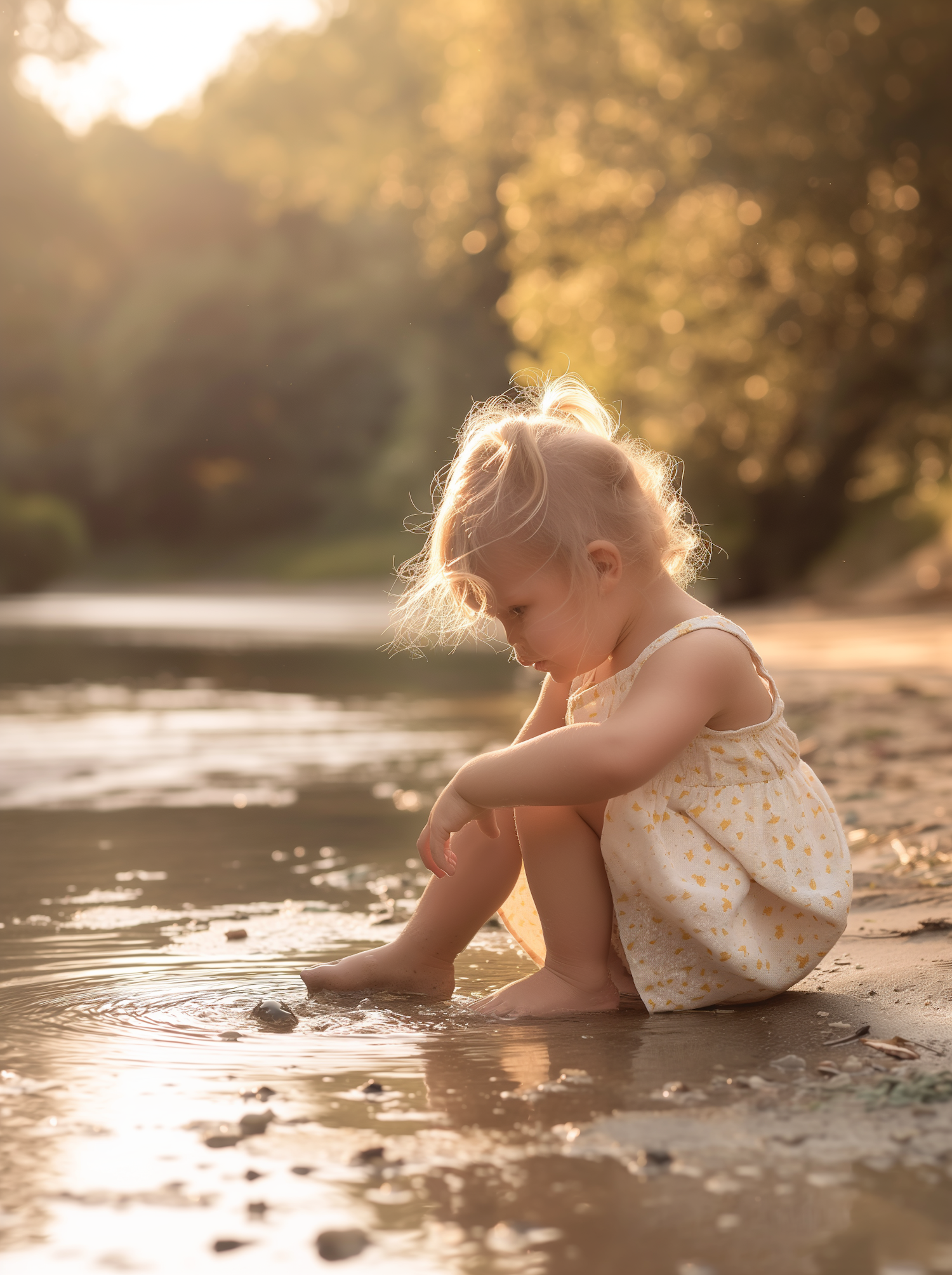 A young child in a light dress plays by a sunlit stream, creating a serene and idyllic scene of childhood wonder.