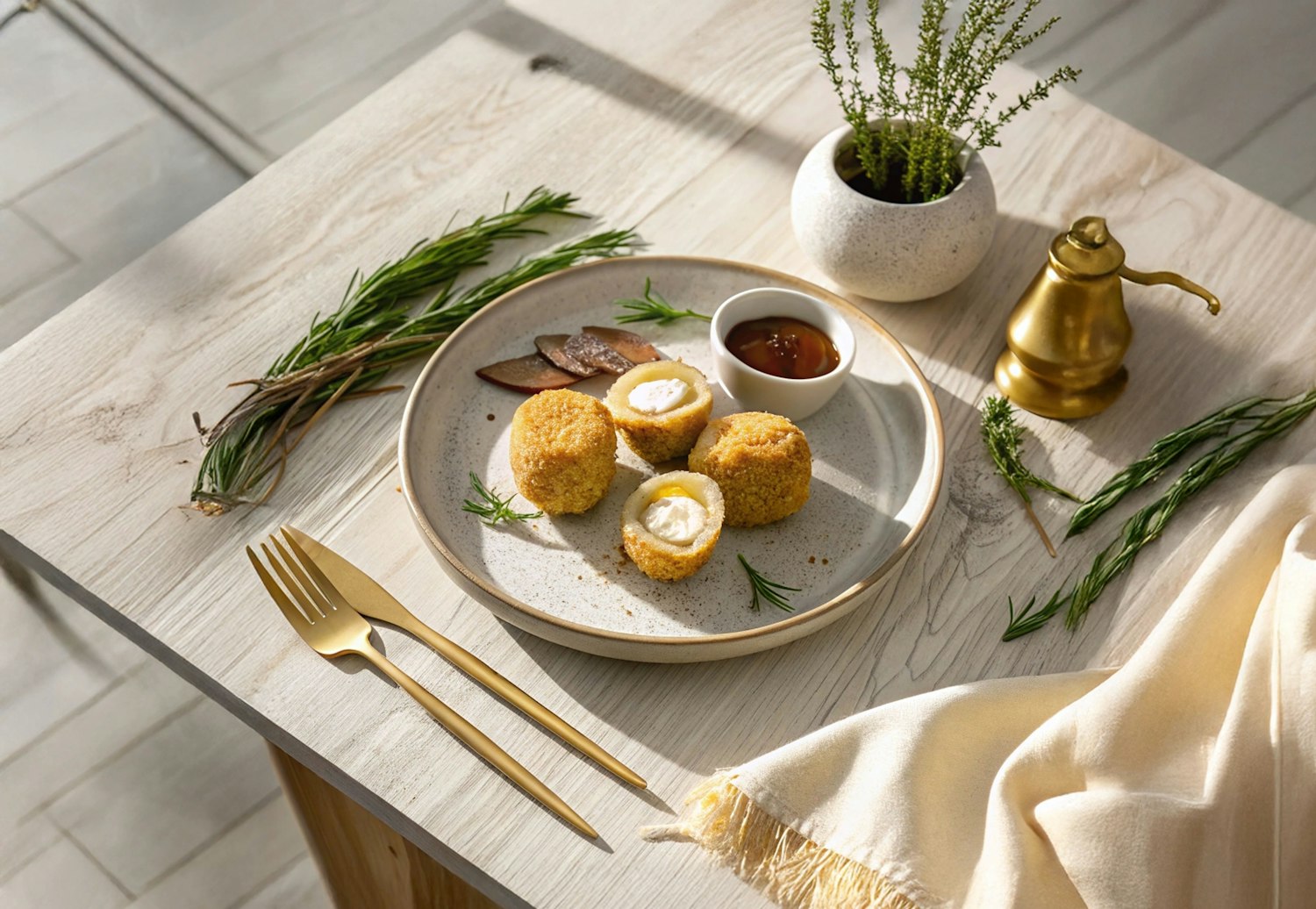 Golden breaded appetizers with creamy filling, served with sauce and herbs on a rustic table with elegant gold cutlery.