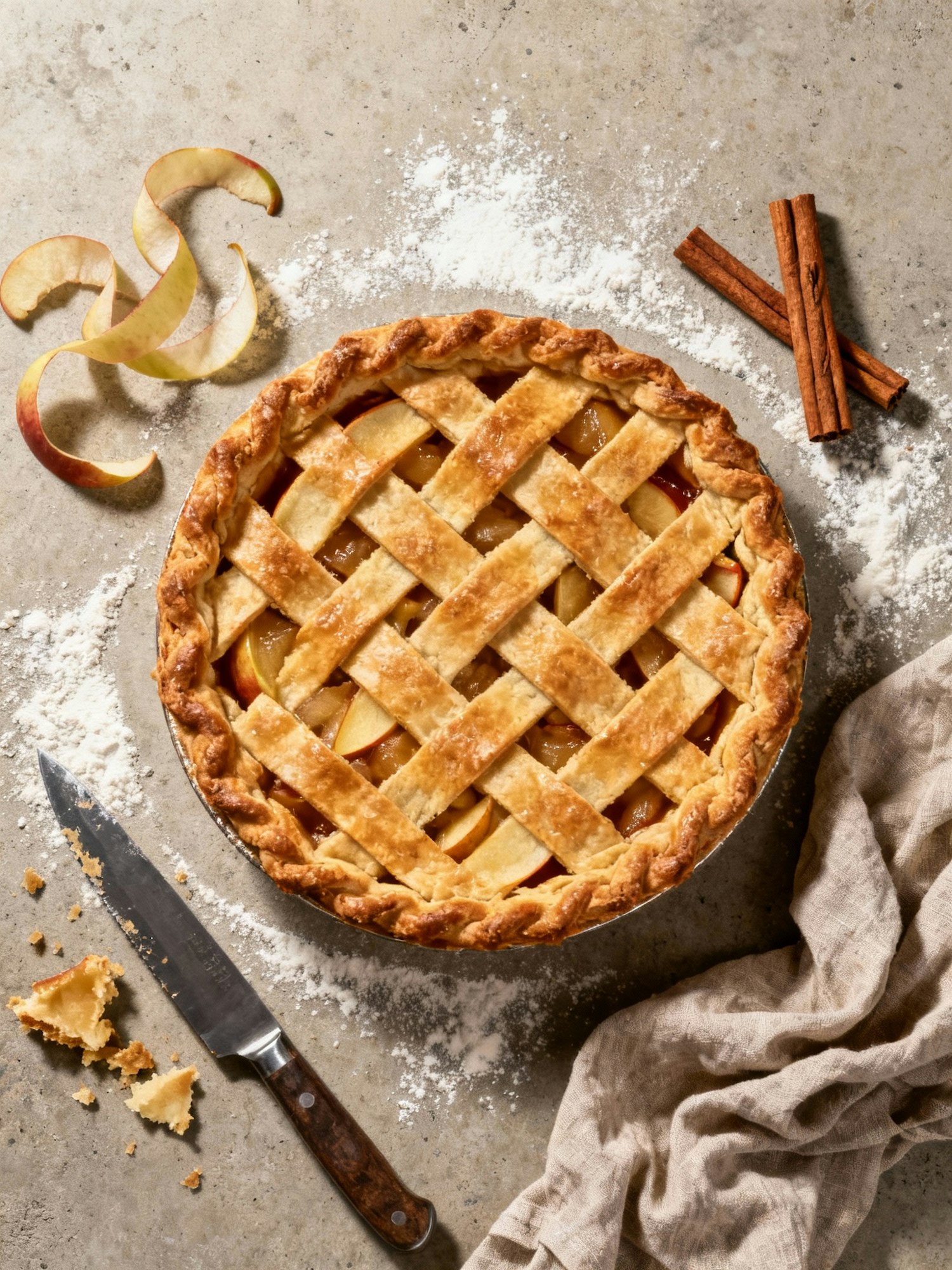 Ultra-real overhead flat lay of a golden apple pie with rustic lattice crust, flour dust, peeled apple ribbons, cinnamon sticks, and a knife with flaky crumbs nearby; linen napkin casually wrinkled. Medium-format (150MP); 55–65 mm at f/8; big soft overhead 5600 K diffusion, perimeter flags for gentle falloff; ISO 100. Angle: true 90° top-down. Surface: pale concrete. Color: warm browns, muted golds. Negative: perfect grid symmetry, fake glaze, HDR contrast, color cast, logos, watermarks.