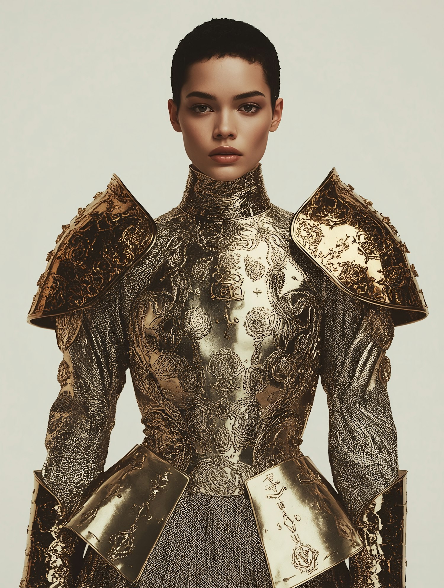 A striking portrait of a person in ornate golden armor, showcasing intricate details and a regal, commanding presence.