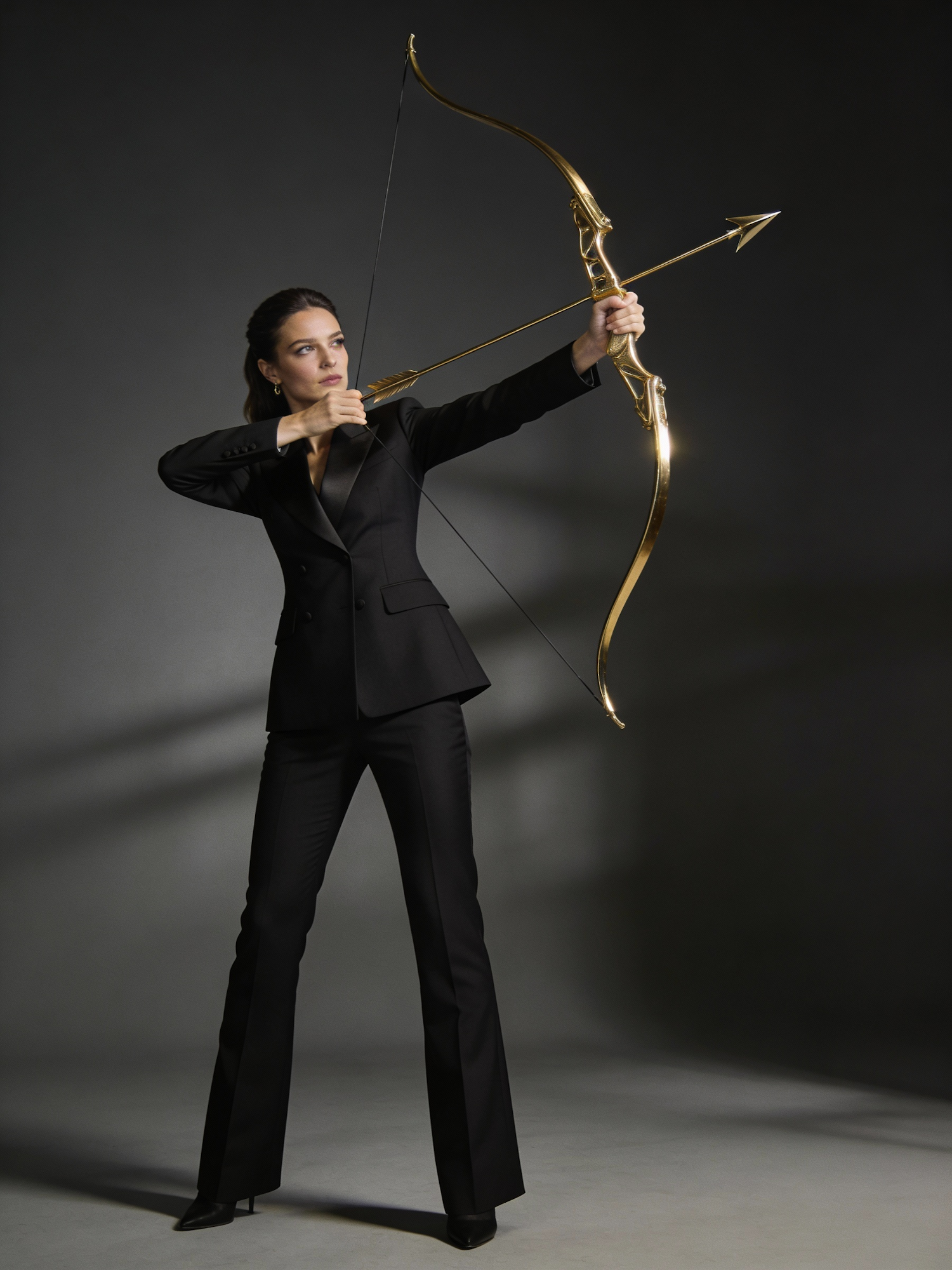 A woman in a black suit aims a golden bow with precision, set against a dark background, creating a striking and dramatic scene.