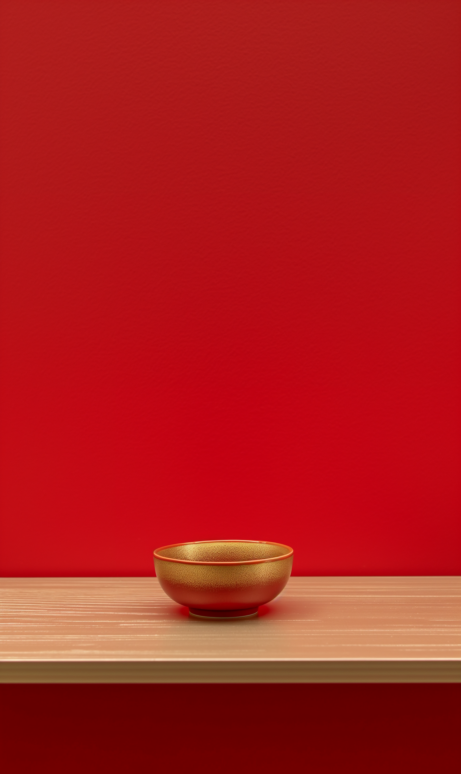 Golden textured bowl on a light wooden shelf against a bold red background, creating a minimalist and elegant composition.
