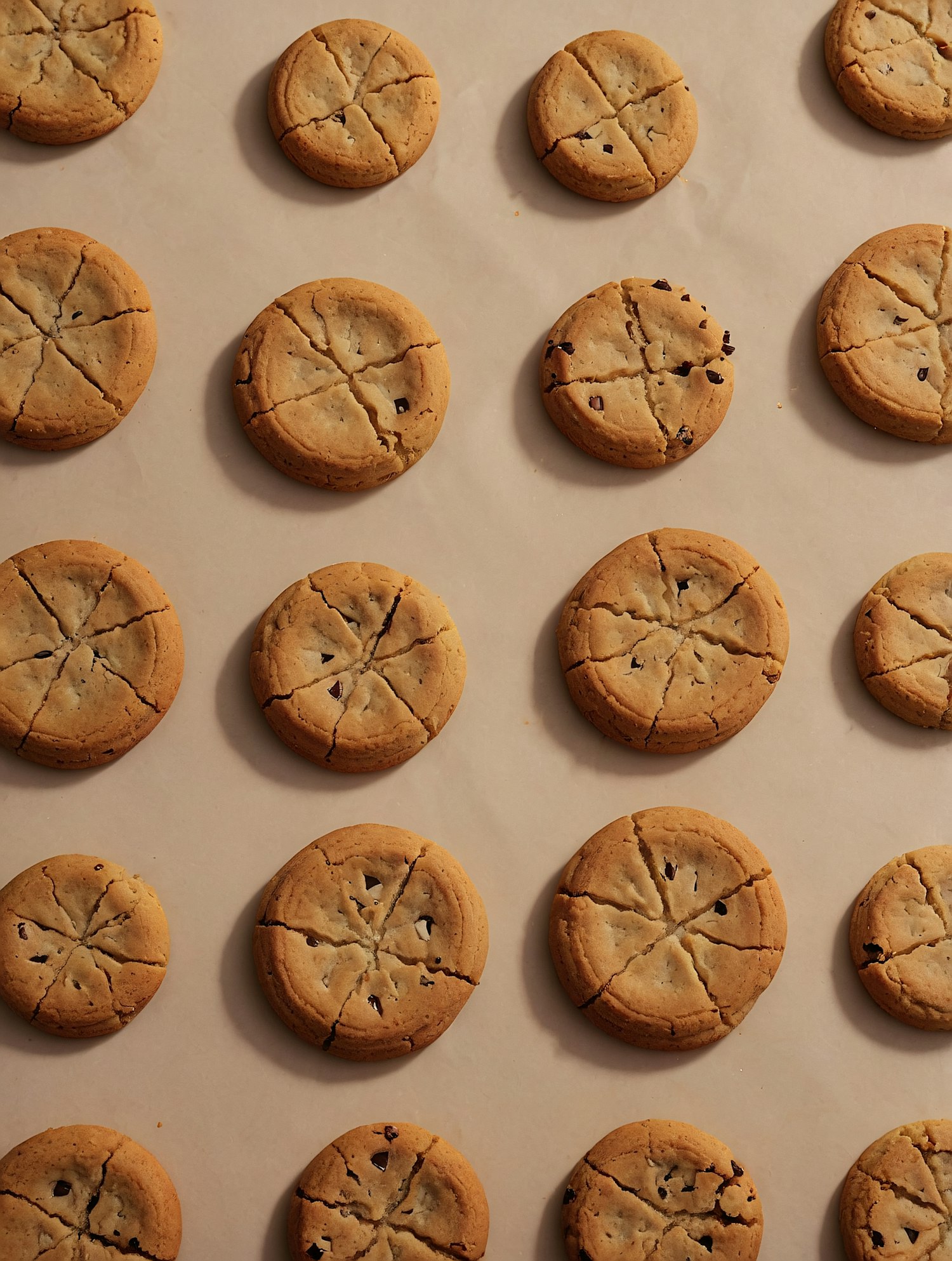 Golden brown cookies divided into six sections, some with chocolate chips, arranged in a neat grid on parchment paper.