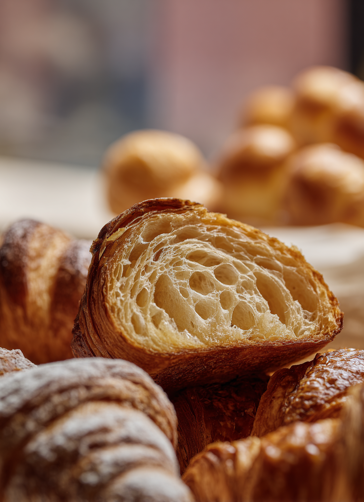 Freshly baked golden croissants with crispy layers, set against a blurred background showcasing additional pastries.