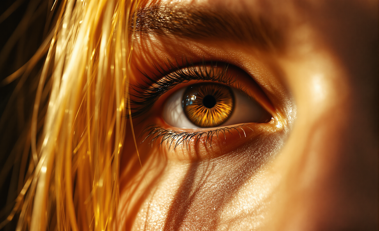 Close-up of a golden brown eye surrounded by blonde hair, with warm lighting emphasizing the iris and skin texture.