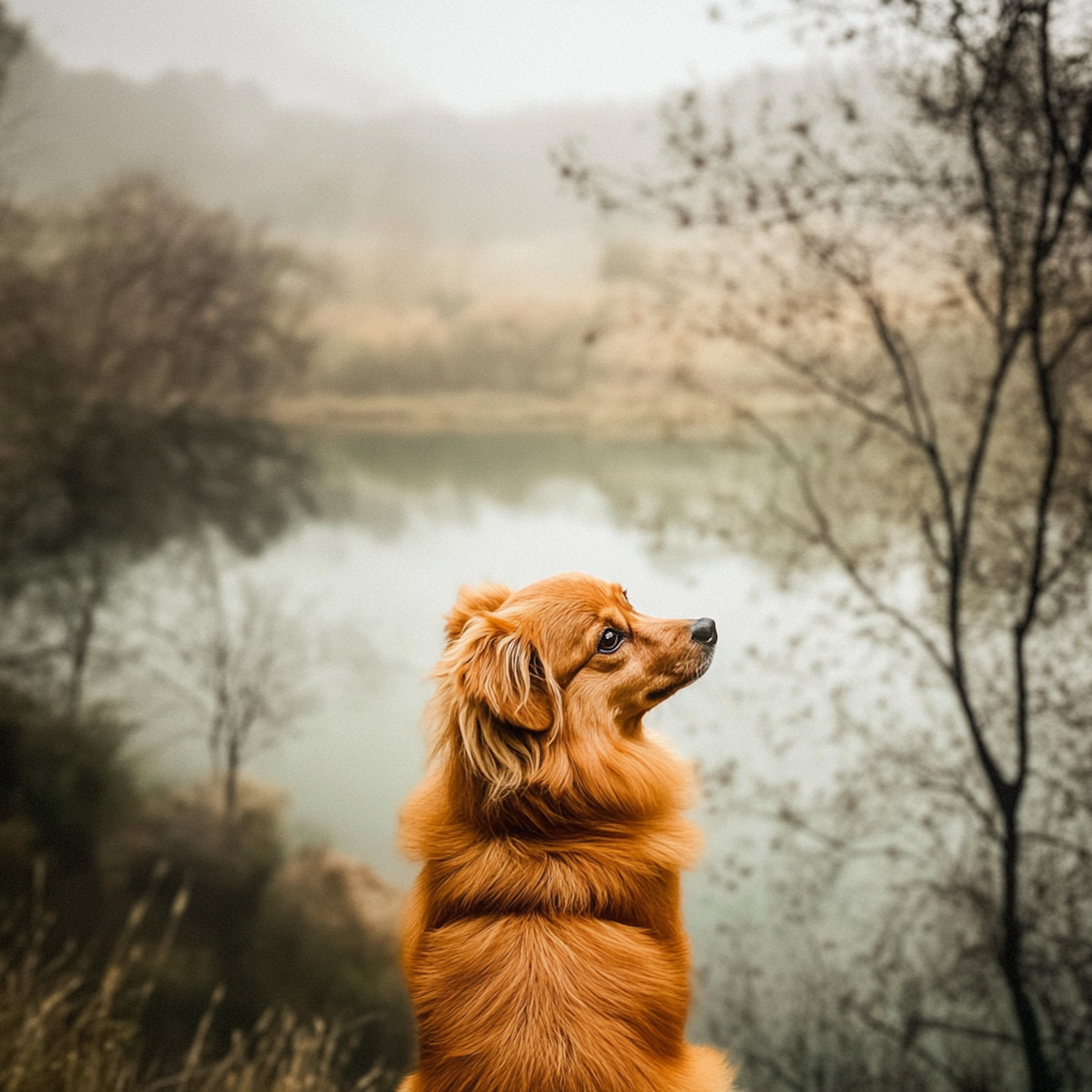 Golden-brown fluffy dog gazes over a serene lake, surrounded by misty trees and hills, creating a tranquil and picturesque scene.