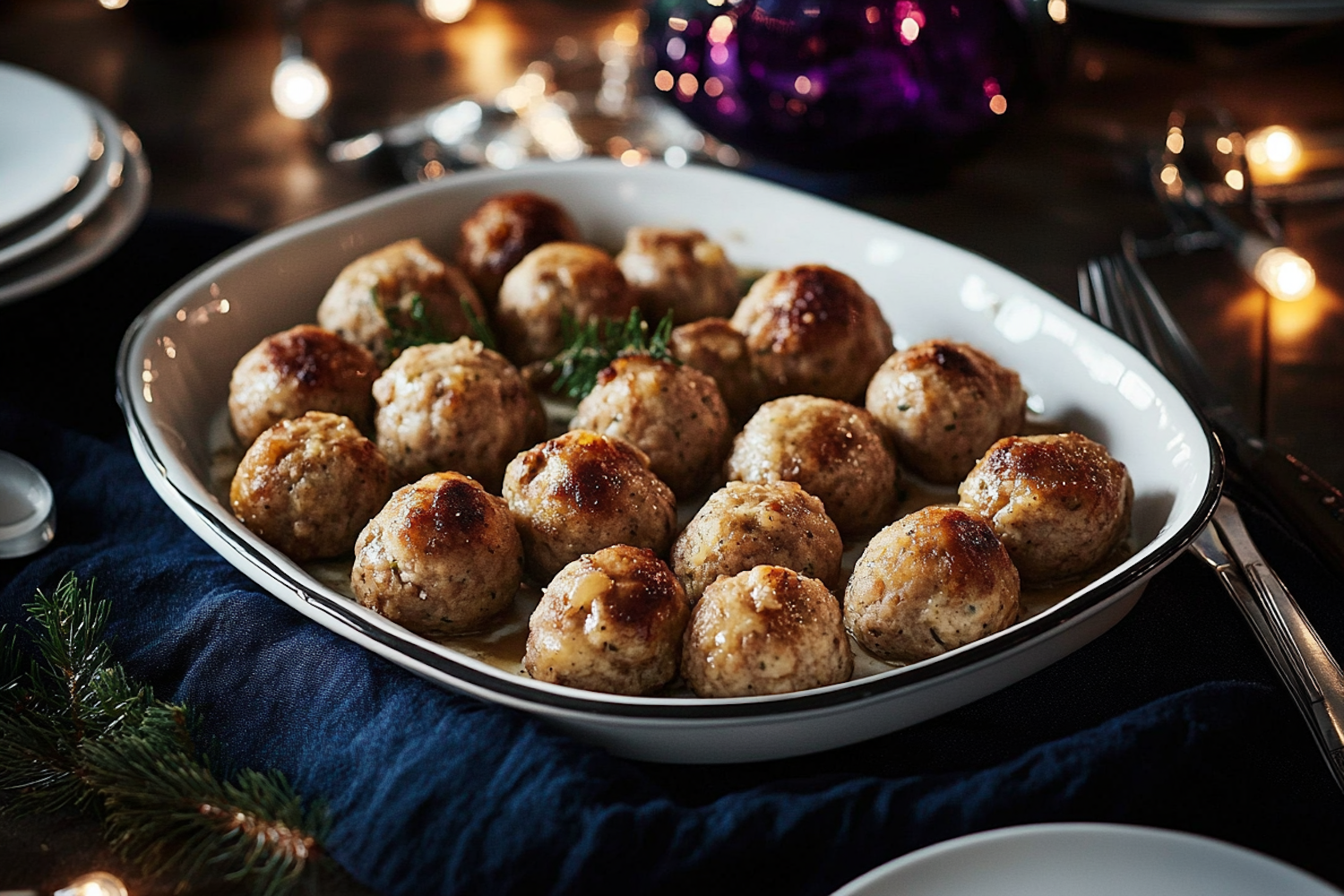 Golden-brown meatballs in a white dish, garnished with herbs, set against a cozy, warmly lit background with festive decor.